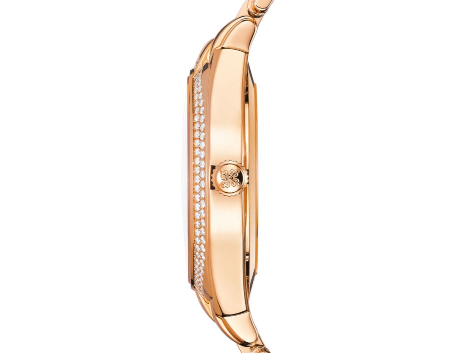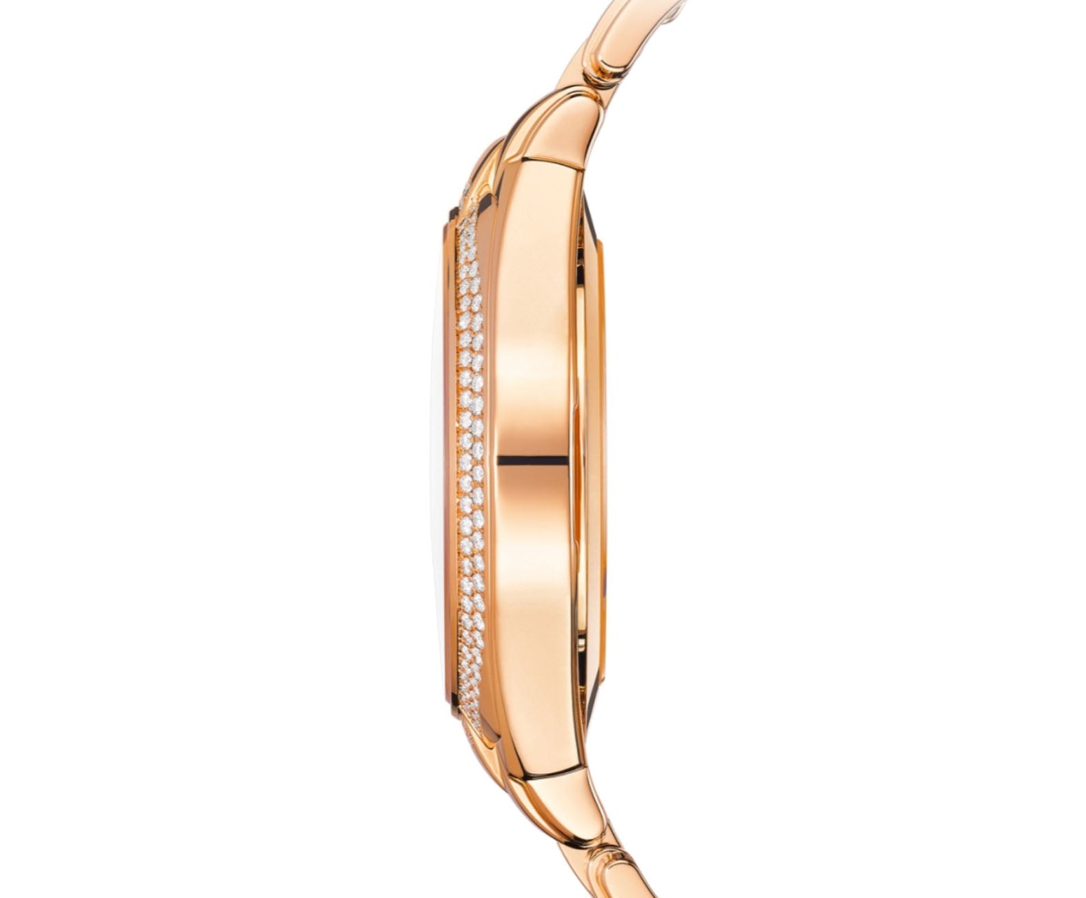 Case is made of mirror finished 18k rose gold, as is the bracelet mounted on the watch. The bezel is set with a total of 160 diamonds, weighing about 0.81 ct.