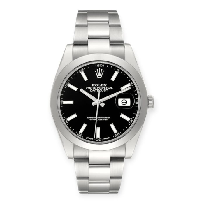 Functions are displayed on a matte black dial with index hour markers. These functions include hours, minutes, seconds and date.