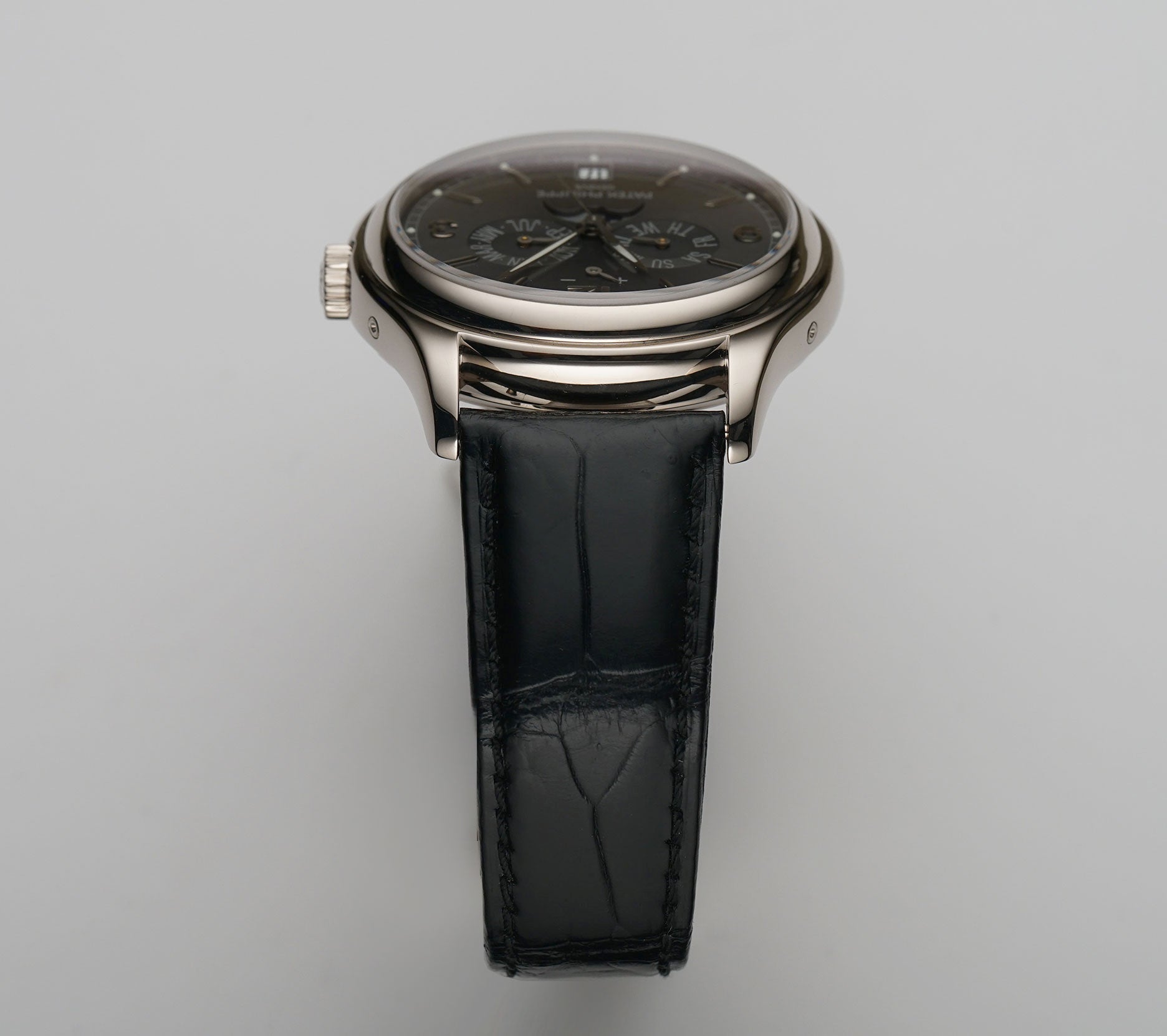 The case is of a mirror-finished 18k white gold, as is the bezel mounted atop. It is paired with a black leather Patek Philippe strap, which is in a 8/10 condition, and that is accompanied by an 18k white gold Patek Philippe deployment buckle.
