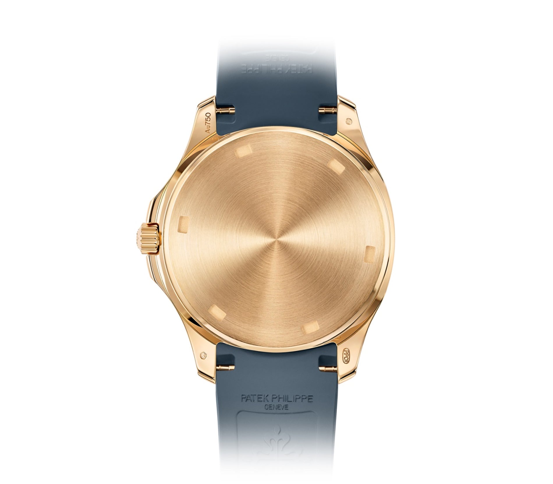 Functions are shown on a Opaline blue-grey dial with the aquanaut pattern, luminous hands and hour markers, and rose gold applied numerals. These functions include hours, minutes, seconds, local and home.