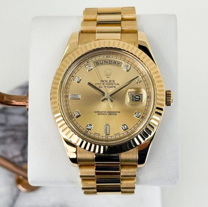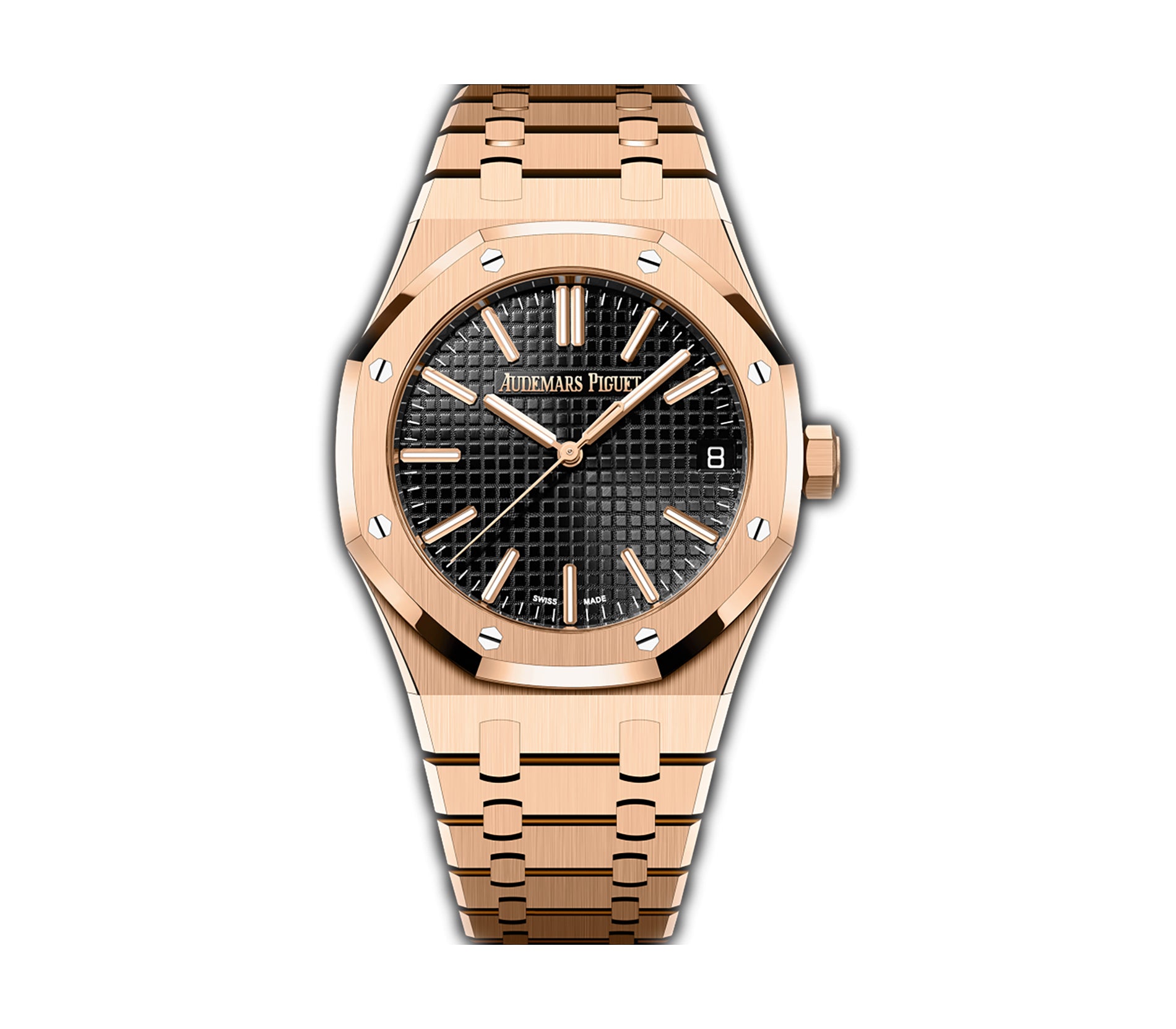 The case is made of mostly brush-finished 18k rose gold with hints of high-polish beveled edges. Mounted atop the case is a brush-finished 18k rose gold bezel with high-polish finished beveled edges. The 18k rose gold bracelet follows the same configuration of finish.
