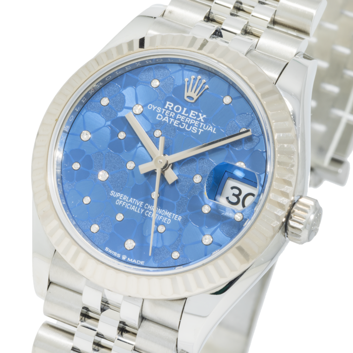 Functions are displayed on a blue dial with index markers. Those functions include hours, minutes, seconds and date.
