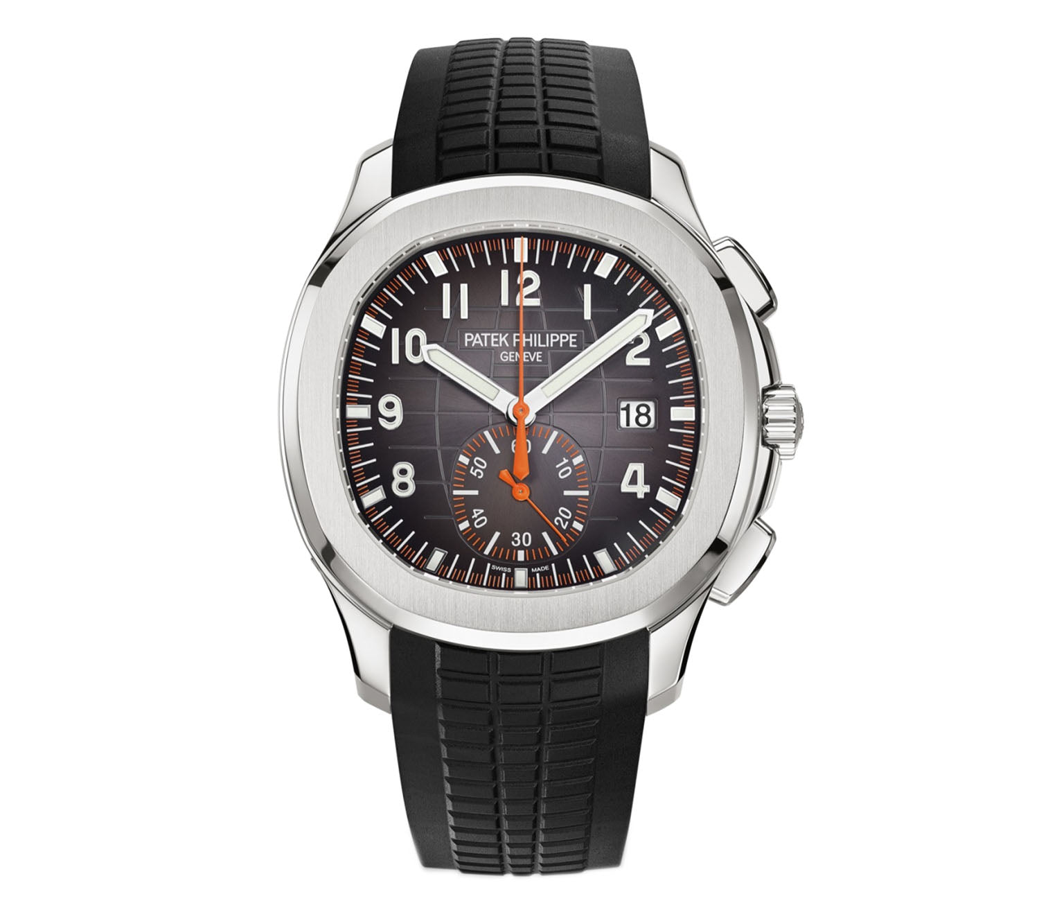 Functions are displayed on Sunburst charcoal gray with black-gradient rim, embossed aquanaut pattern dial with luminous hands and hour markers. These functions include hours, minutes, chronograph and minutes register.