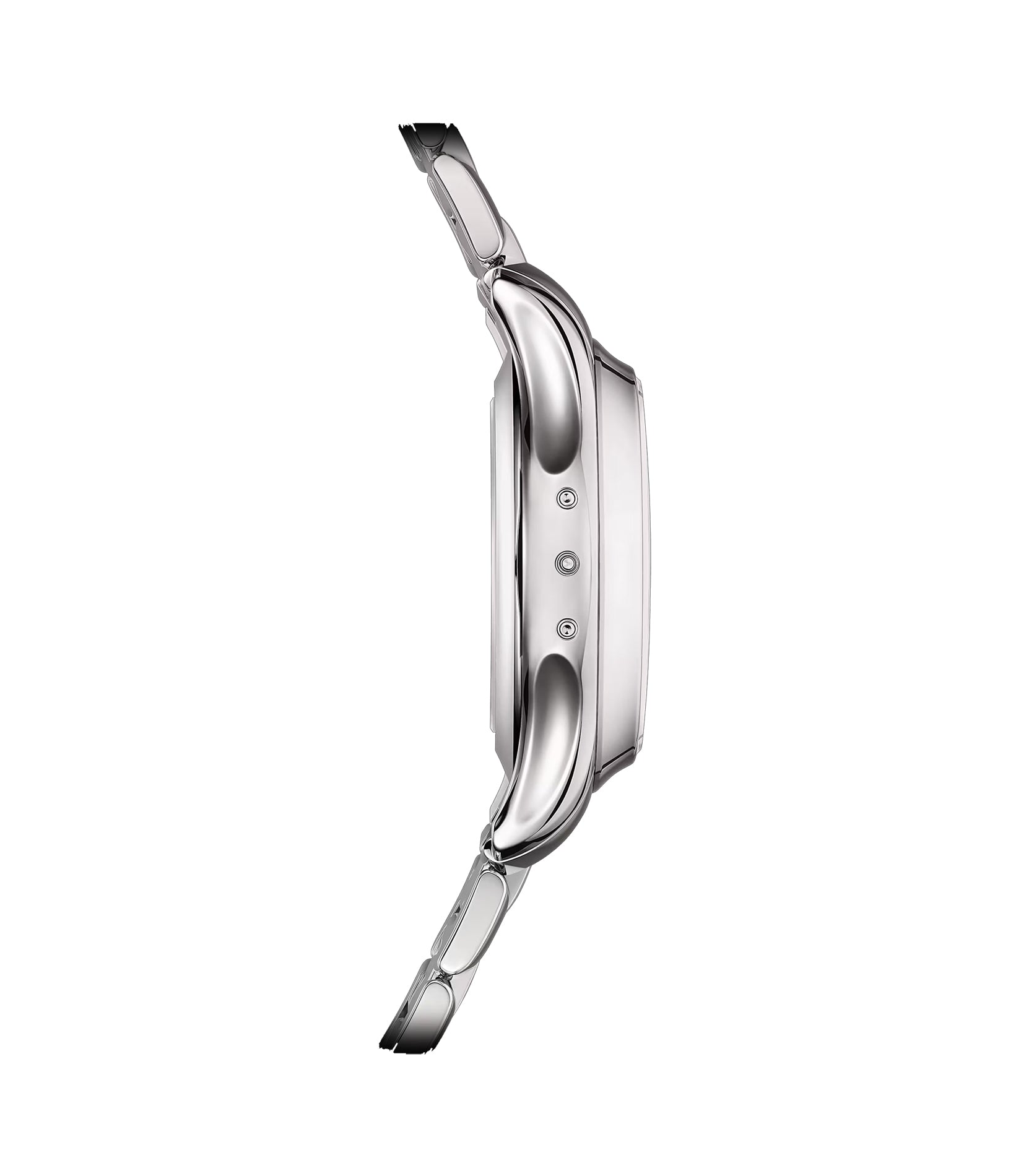 The case is made of a mirror finish stainless steel including push buttons and crown. Mounted atop the case is a mirror finish stainless steel bezel. The watch is paired with a mirror finish stainless steel bracelet.
