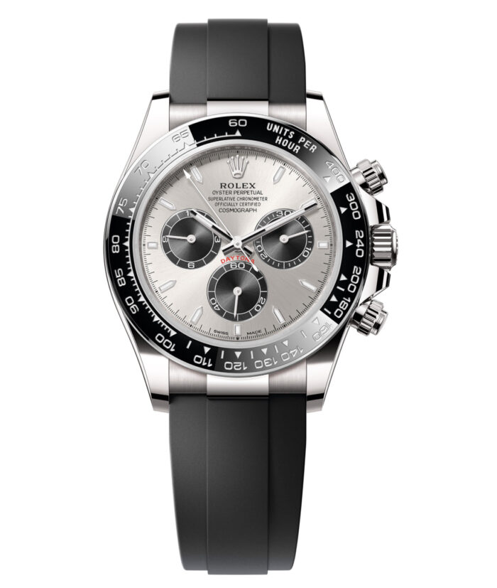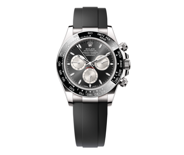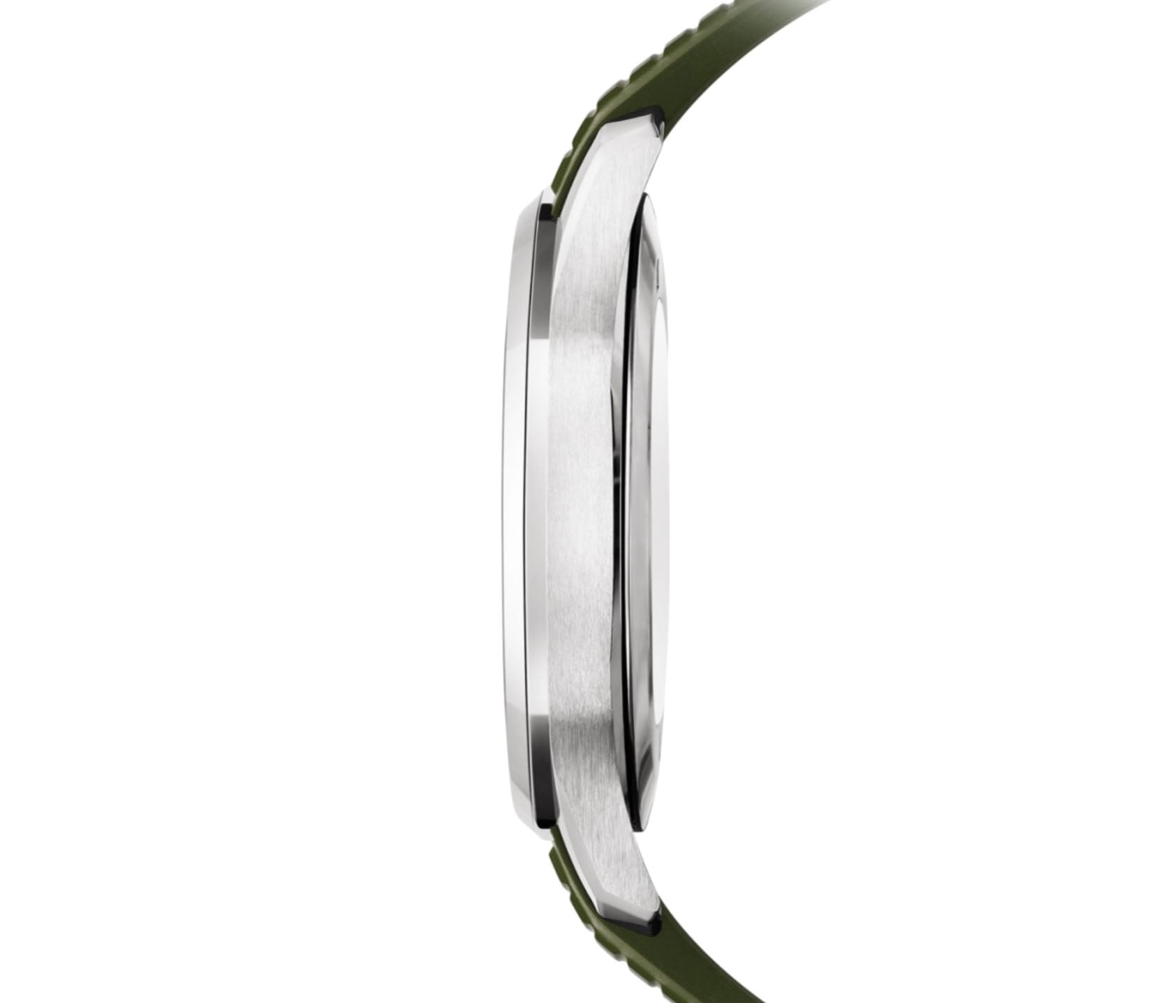 Case is made of 18k white gold with a combination of both mirror and satin finishes. The bezel mounted atop is of 18k white gold with a satin finished base and a mirror finish edge. As for the strap, it is a khaki green composite tropical (composite because they added certain elements to rubber in order to enhance the durability) rubber strap that features a design which compliments the dial.