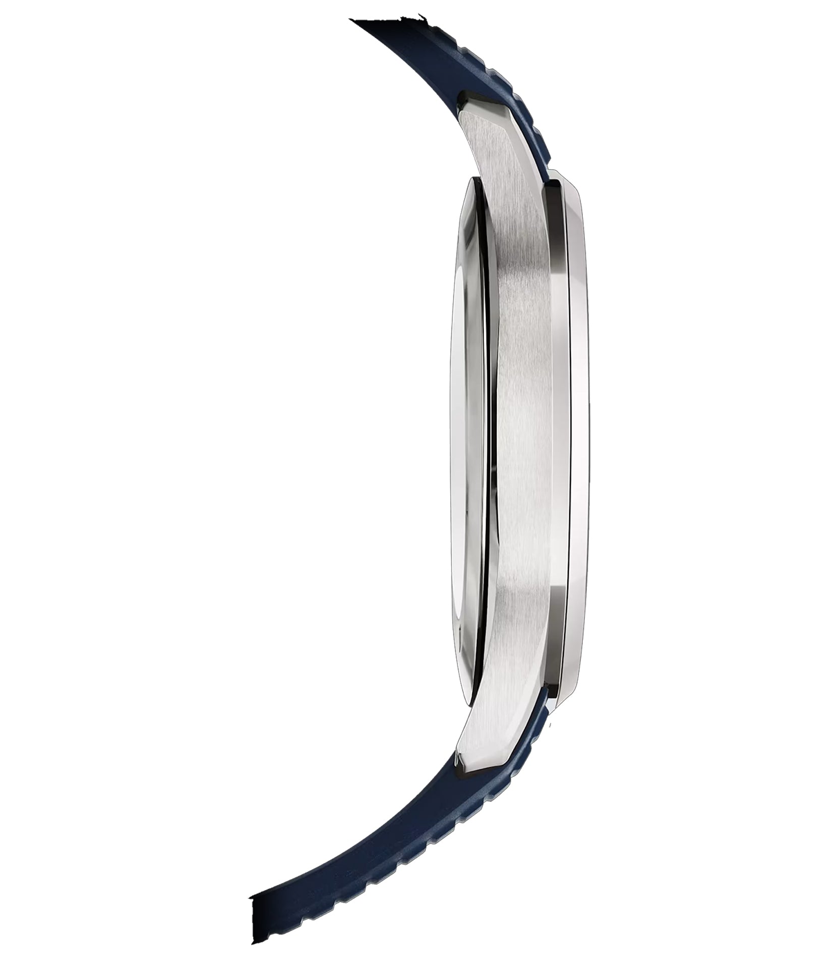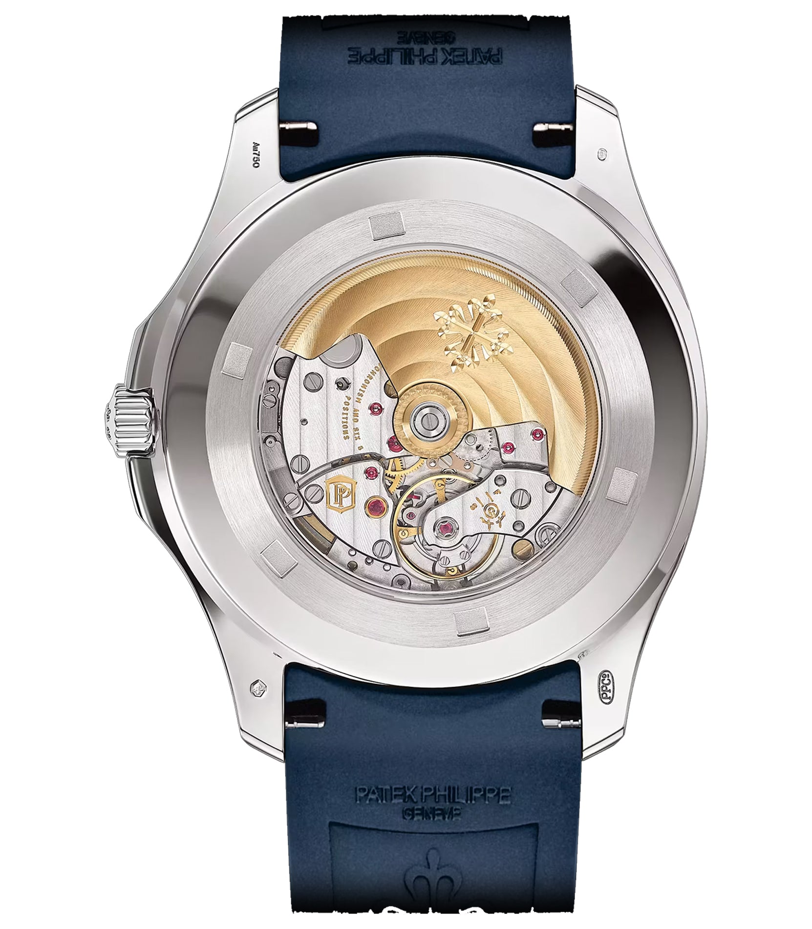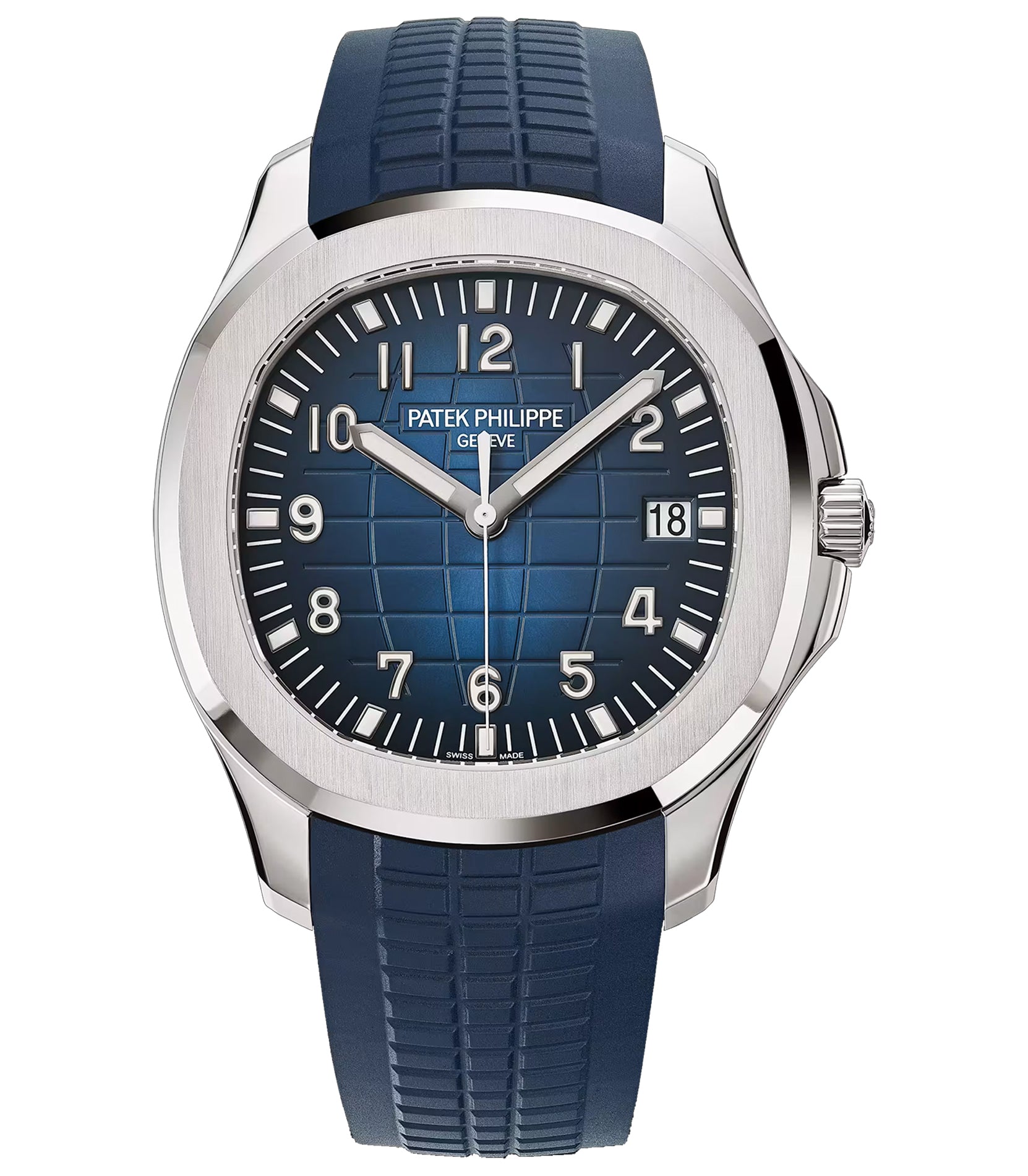 Case is made of 18k white gold with a combination of both mirror and satin finishes. The bezel mounted atop is of 18k white gold with a satin finished base and a mirror finished edge. As for the strap, it is a midnight blue composite tropical (composite because they added certain elements to rubber in order to enhance the durability) rubber strap that features a design which compliments the dial.