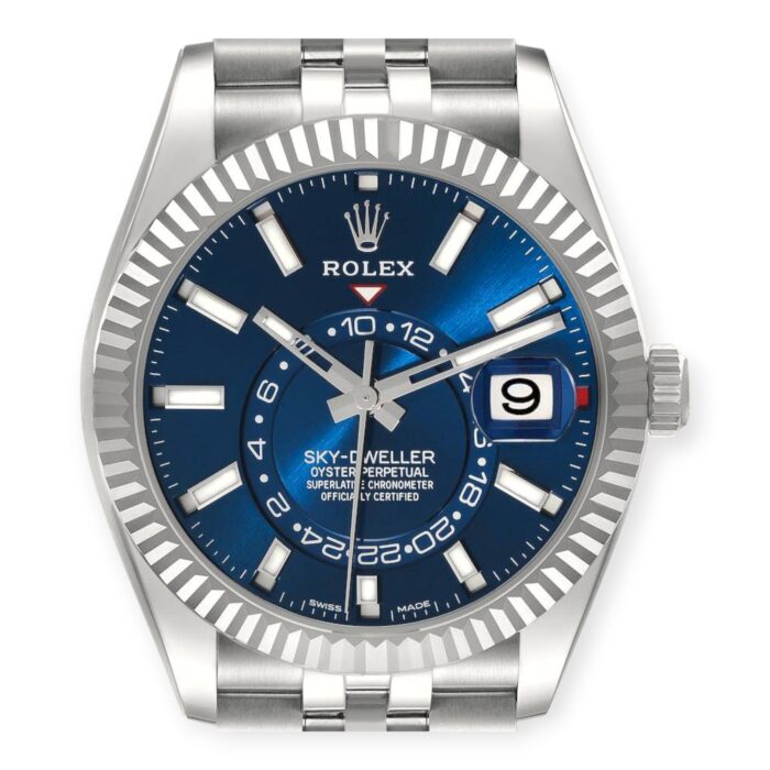 Functions are displayed on a blue dial with index markers. The functions include hours, minutes, seconds and date.