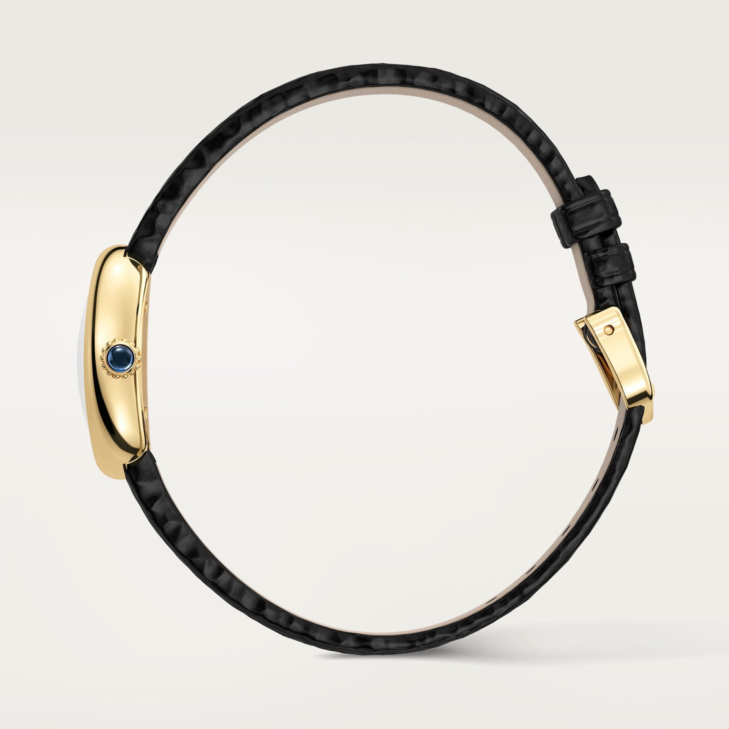 Baignoire de Cartier watch, mini model, quartz movement. 18K yellow gold (750/1000) case. 18K yellow gold (750/1000) beaded crown set with a sapphire cabochon. Silvered dial, blued-steel sword-shaped hands, sapphire crystal. Black varnished calfskin strap. Length: 24.6 mm, width: 18.7 mm, thickness: 7.2 mm. water-resistant up to 3 bar (approx. 30 meters/100 feet).
