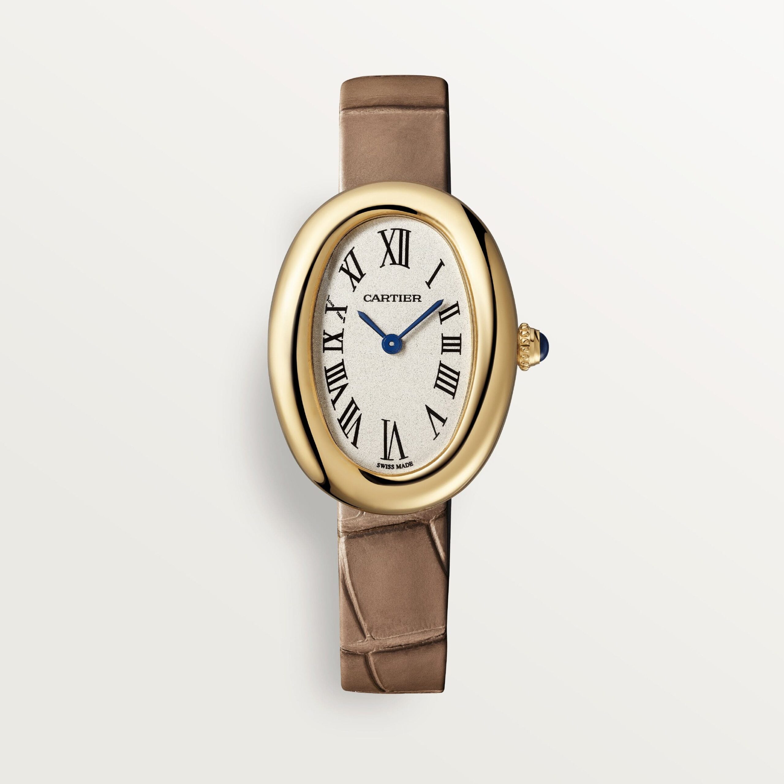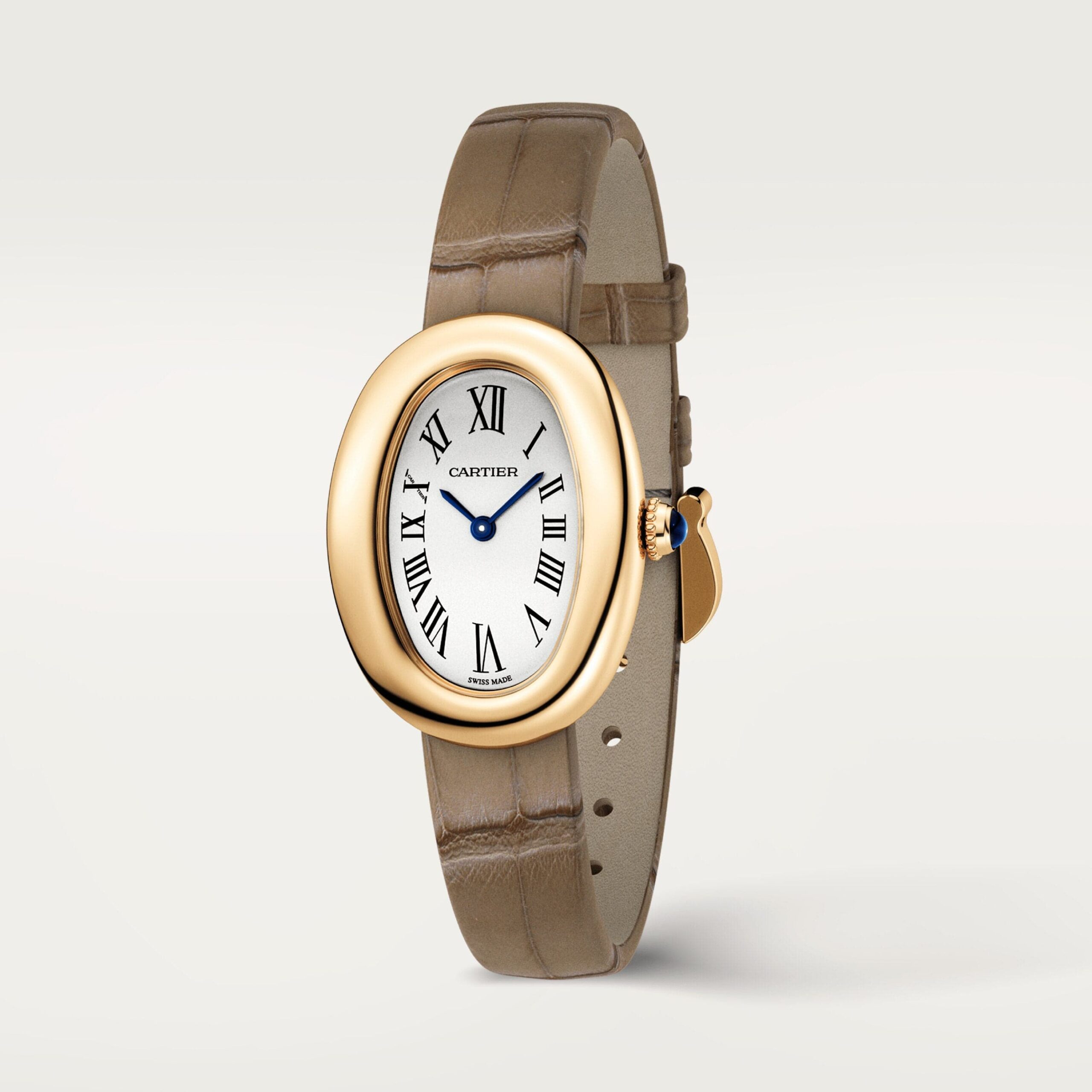 Baignoire watch, small model, quartz movement. Yellow gold 750/1000 case. Yellow gold 750/1000 beaded crown set with a sapphire cabochon. Silver dial, blued-steel sword-shaped hands, sapphire crystal. Strap in taupe leather, with yellow gold 750/1000 ardillon buckle. Case dimensions: 31 mm x 23 mm. Thickness: 7 mm. Water-resistant to 3 bar (approx. 30 meters/100 feet).