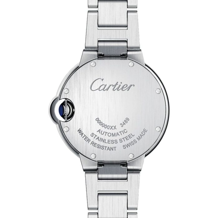 Ballon Bleu de Cartier watch, 33 mm, mechanical movement with automatic winding. Steel case, fluted crown decorated with a synthetic spinel cabochon, silvered guilloché opaline dial, Roman numerals, blued-steel sword-shaped hands, sapphire crystal, steel bracelet. Case dimensions: diameter: 33 mm, thickness: 9.96 mm. Water-resistant to 3 bar (approx. 30 meters/100 feet).