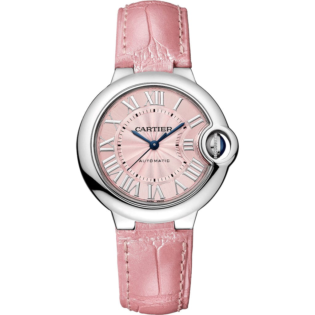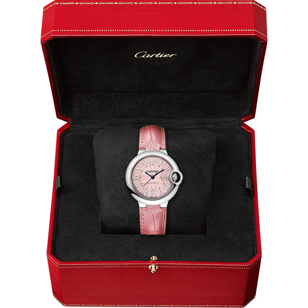 Ballon Bleu de Cartier watch, 33 mm, self-winding mechanical movement. Steel case, fluted crown set with a synthetic cabochon-shaped spinel, pink dial, Roman numerals, blued-steel sword-shaped hands, sapphire crystal, pink alligator skin strap, double adjustable folding steel buckle. Case dimensions: diameter: 33 mm, case thickness: 9.96 mm. Water-resistant to 3 bar (approx. 30 meters / 100 feet).