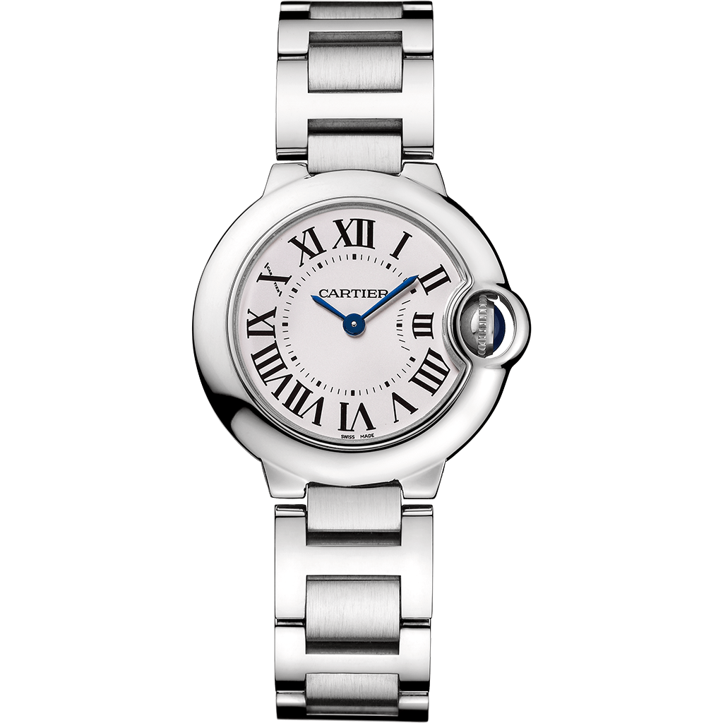Ballon Bleu de Cartier watch, 28 mm, quartz movement. Steel case, fluted crown set with a synthetic cabochon-shaped spinel, silvered opaline dial, Roman numerals, blued-steel sword-shaped hands, sapphire crystal. Interchangeable steel bracelet. Case dimensions: diameter: 1.1”, thickness: 0.34”. Water-resistant up to 3 bar (approx. 30 meters/100 feet).