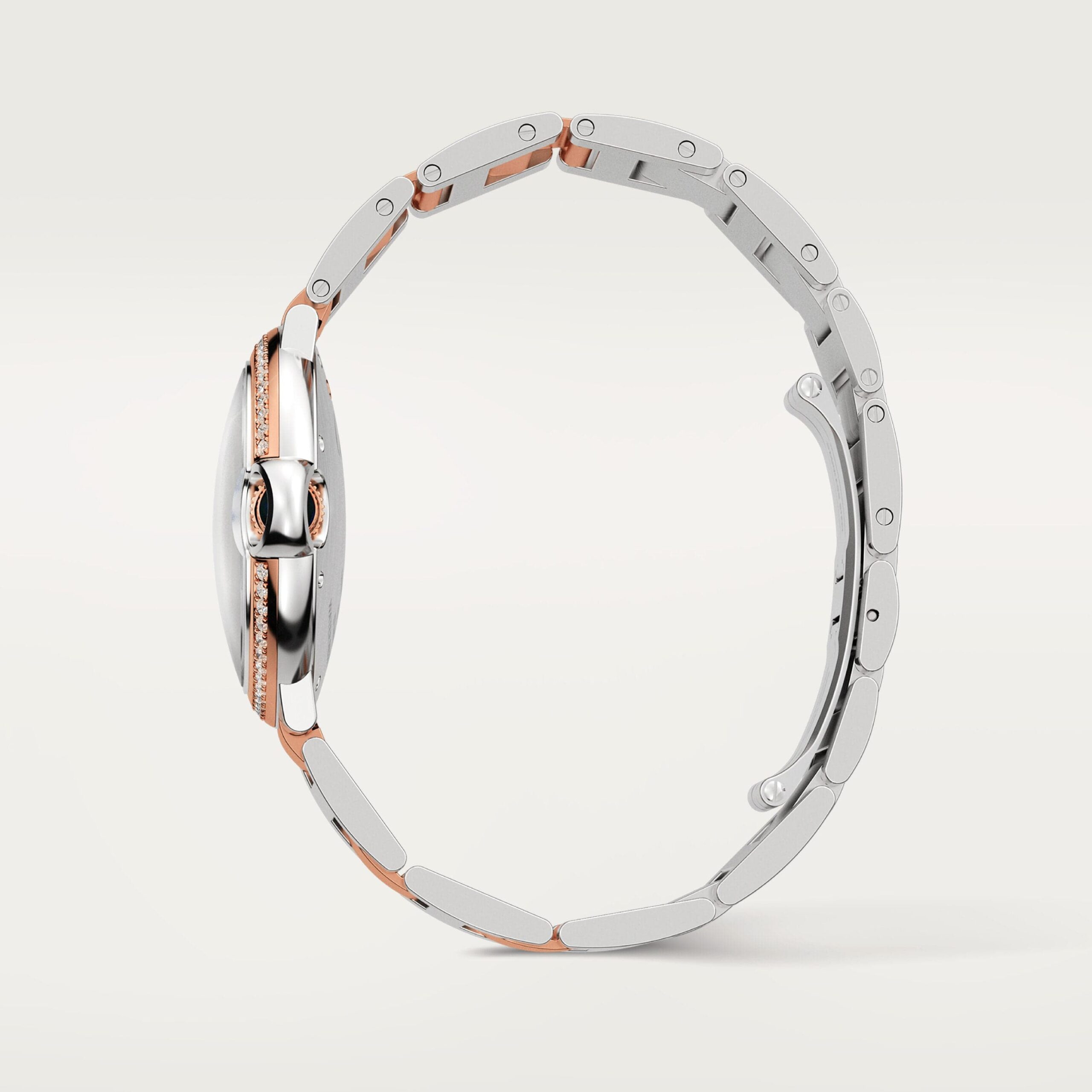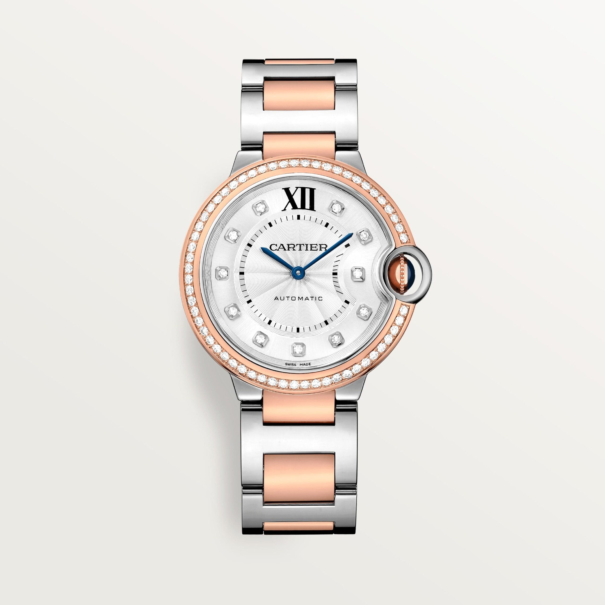 Ballon Bleu de Cartier watch, 36 mm, mechanical movement with automatic winding. Steel case, fluted rose gold 750/1000 crown set with a cabochon synthetic spinel. Rose gold 750/1000 bezel and silver guilloché dial, set with 69 brilliant-cut diamonds totaling 0.77 carat. Blued-steel sword-shaped hands. Sapphire crystal. Rose gold 750/1000 and steel interchangeable bracelet.12.1 mm thick. Water-resistant up to 3 bar (approx. 30 meters/100 feet).