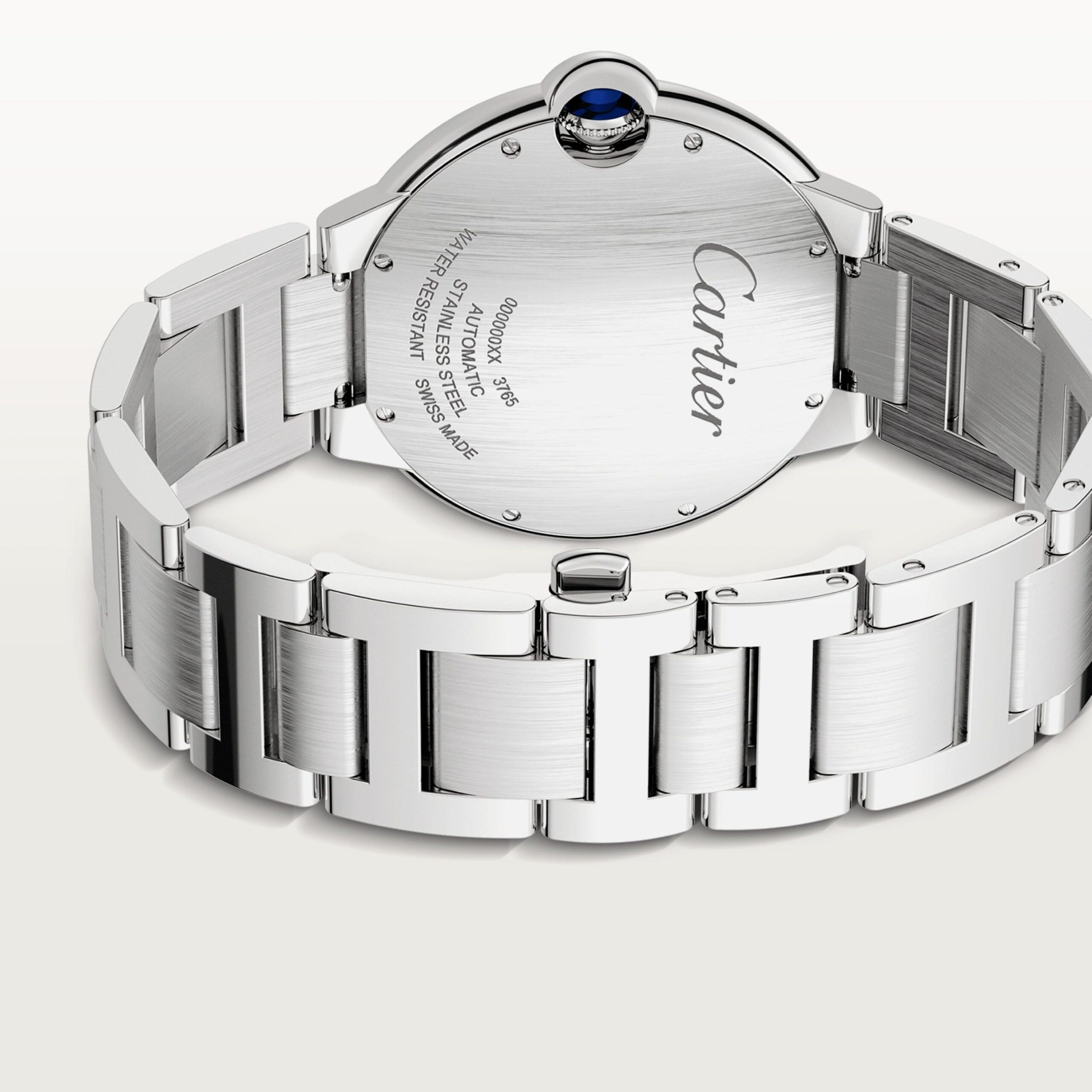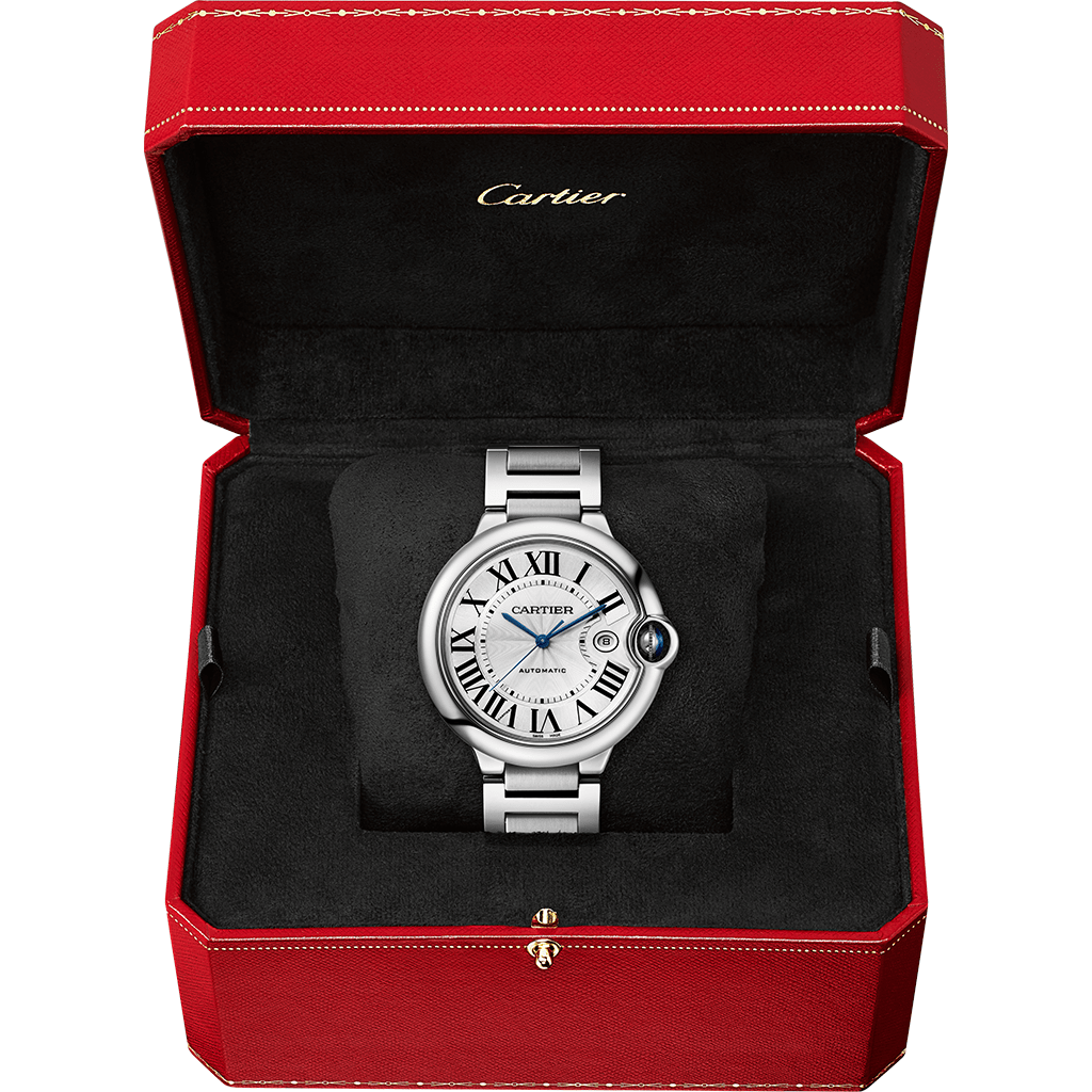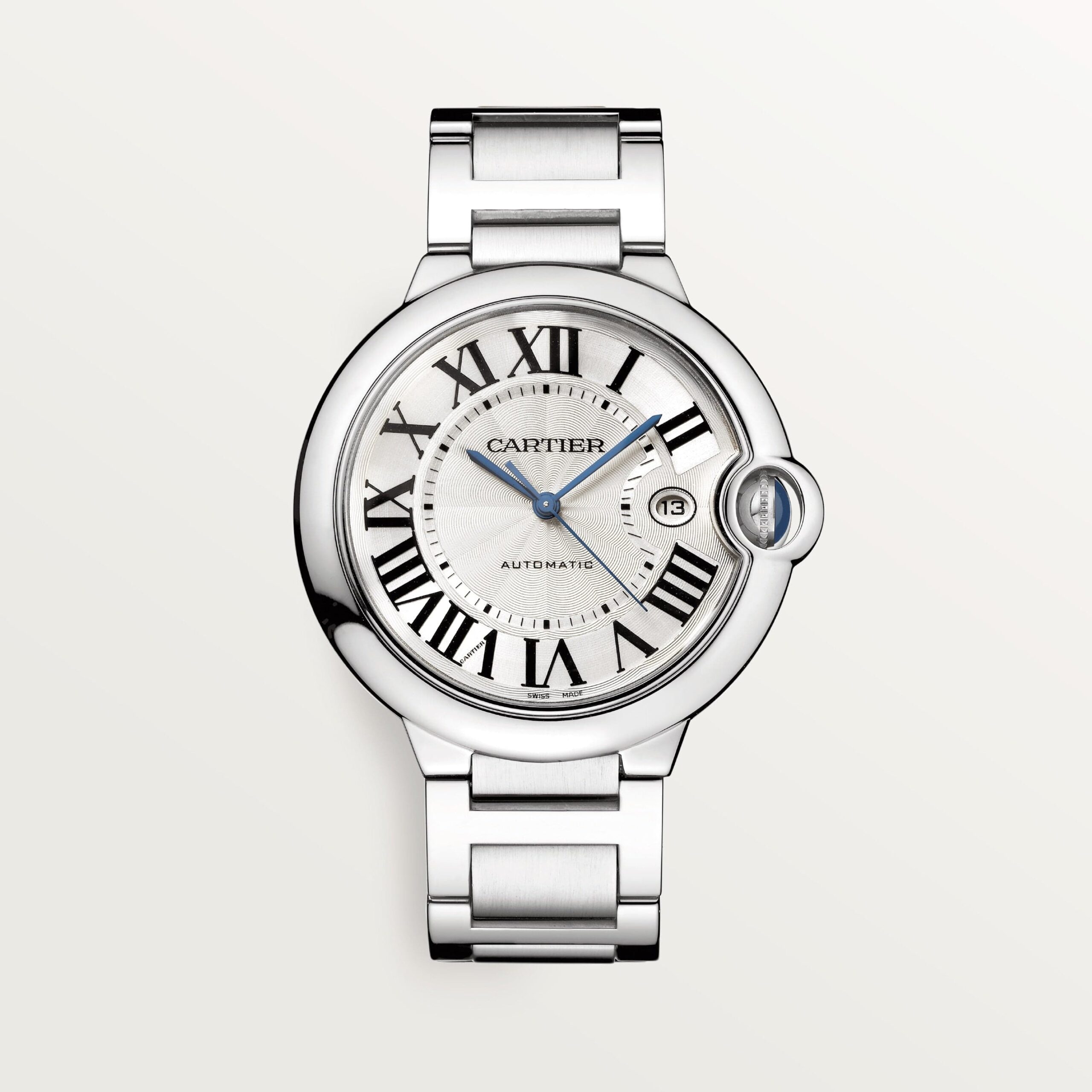 Ballon Bleu de Cartier watch, 42 mm. Mechanical movement with automatic winding, caliber 1847 MC. Steel case, fluted crown set with a cabochon synthetic spinel. Silver guilloché dial. Blued-steel sword-shaped hands. Sapphire crystal. Calendar aperture at 3 o’clock. Steel interchangeable bracelet. Case thickness: 13 mm. Water-resistant up to 3 bar (approx. 30 meters/100 feet).