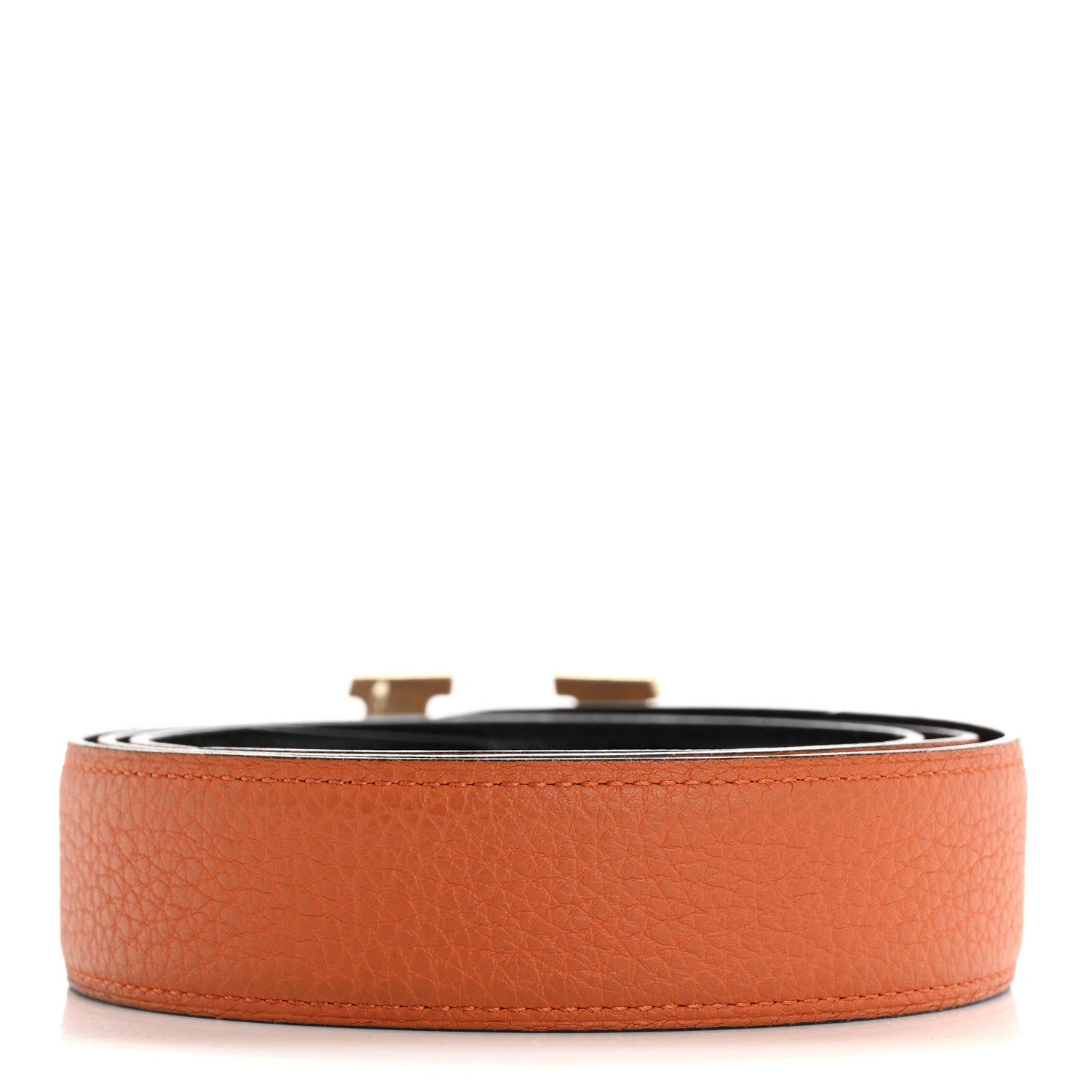 This is an authentic HERMES Box Togo 32mm H Take Off Belt size 90 or 36 in Black and Orange. This unisex belt is reversible from black to orange. It is completed with a brushed gold plated Hermes H buckle.