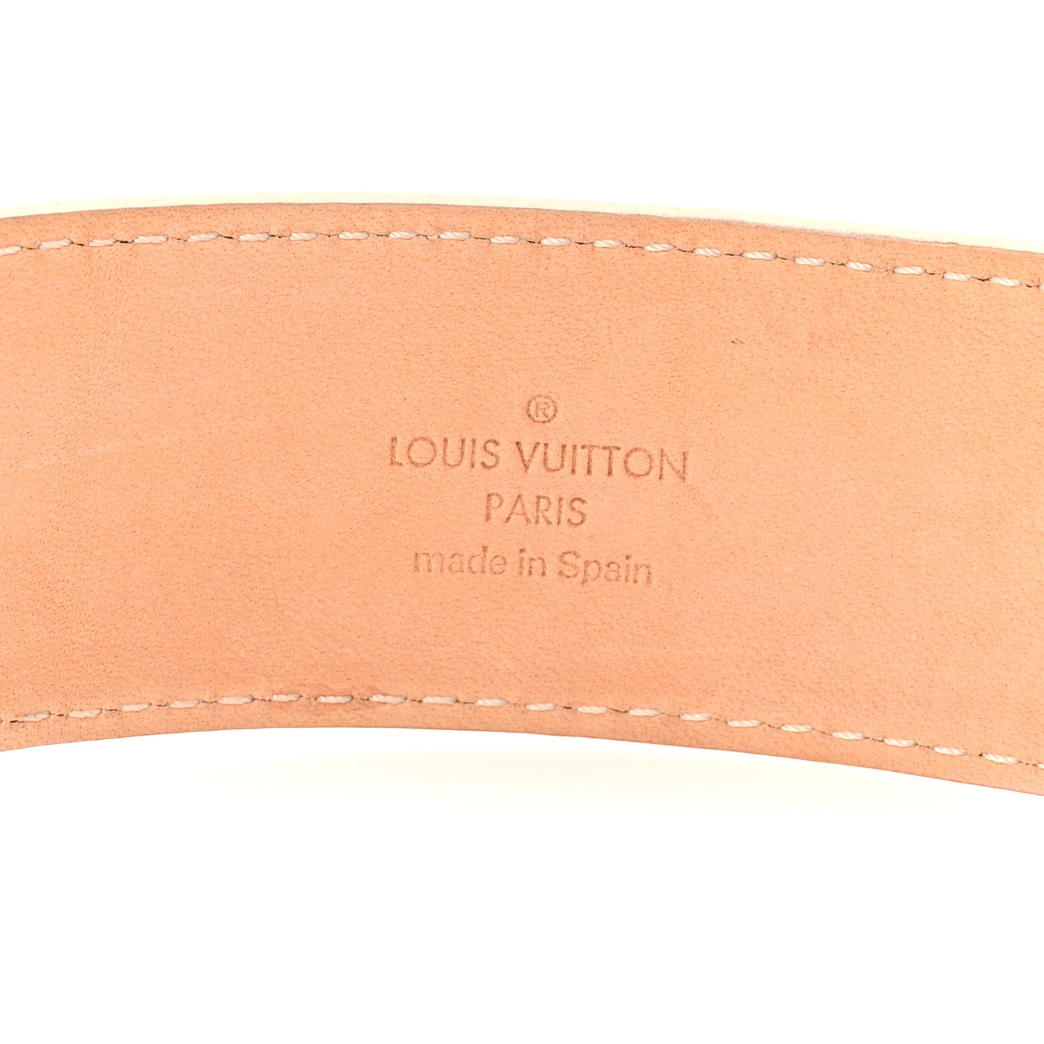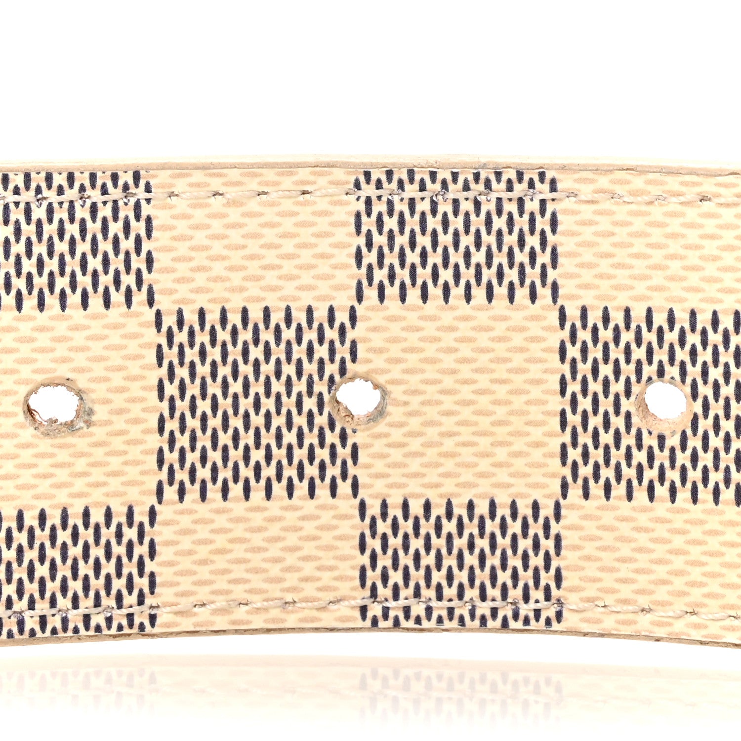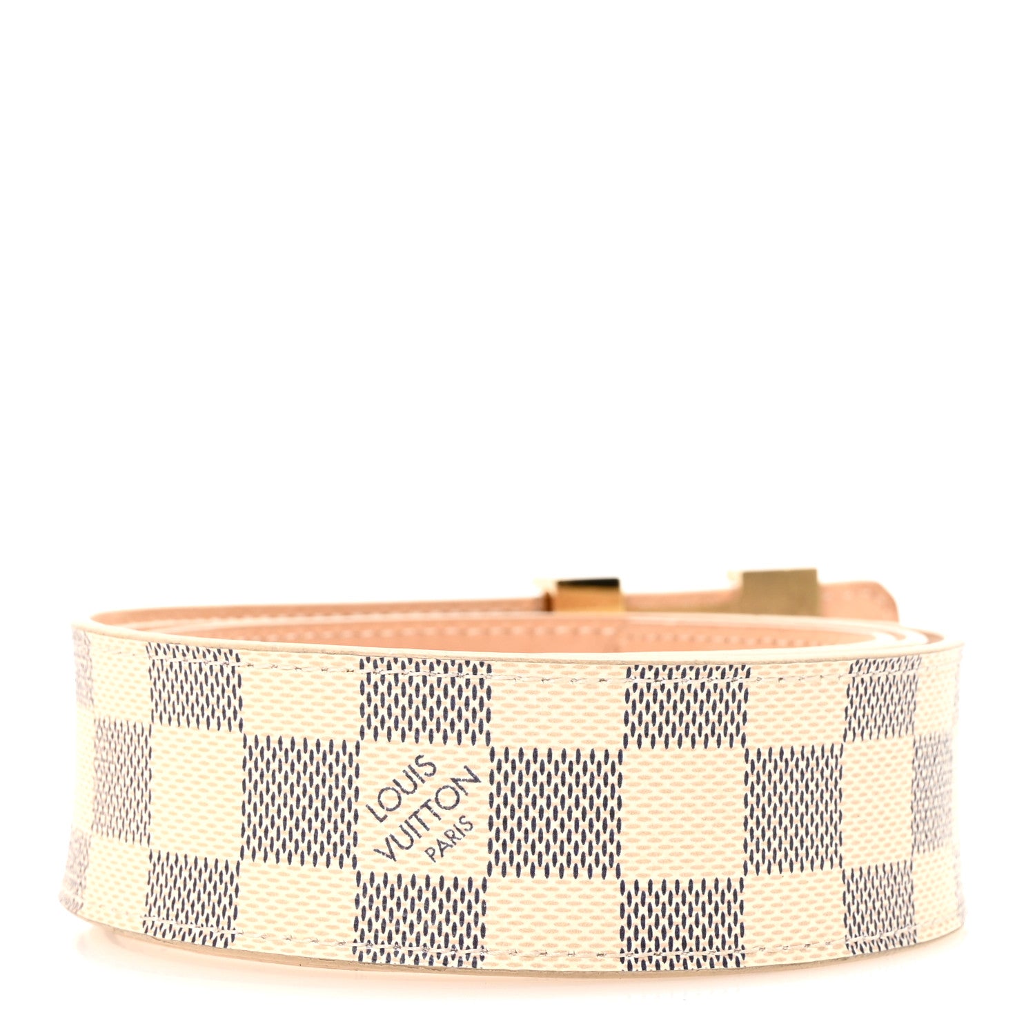 This is an authentic LOUIS VUITTON Damier Azur LV Initiales Belt size 95 or 38. This classic belt features a vachetta leather interior, signature checkerboard coated canvas blue and white exterior, and a brass buckle with “LV” initials.