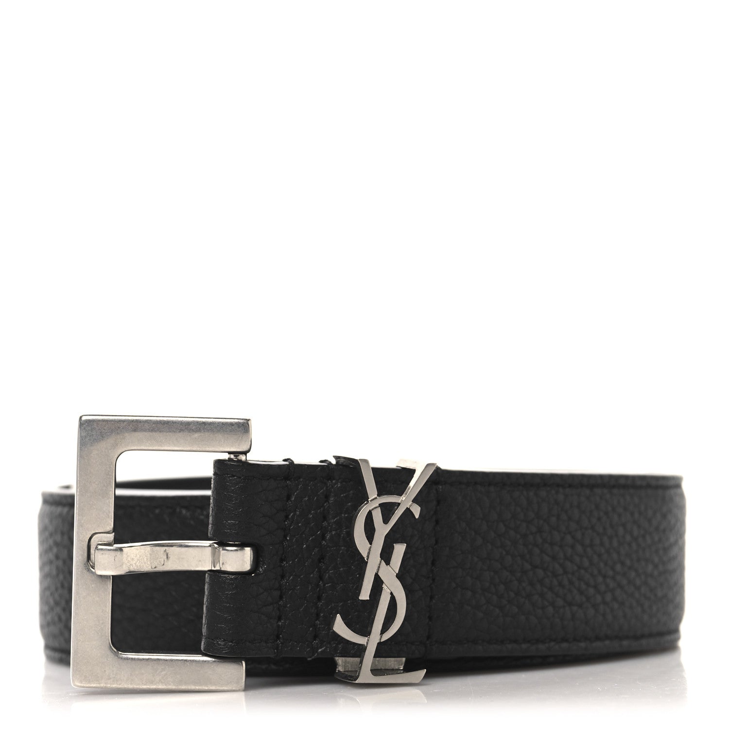 This is an authentic SAINT LAURENT Grained Calfskin Monogram Cassandre Square Buckle Belt size 70 or 28 in Black. This modern style belt is crafted of luxurious textured calfskin leather in black and features an aged silver YSL belt buckle.