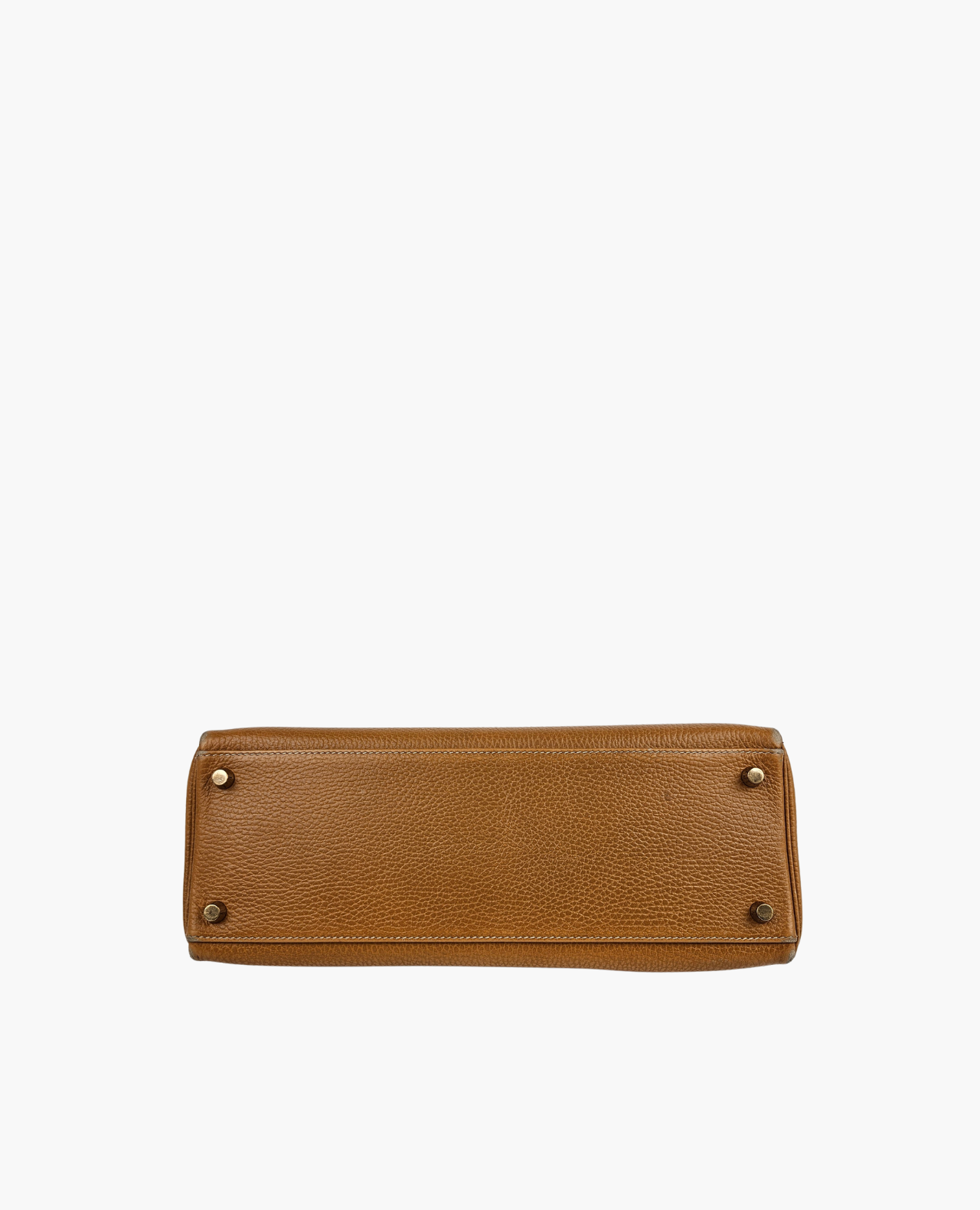 This Kelly 32 is in vintage condition. There is wear on the corners, scratches on the gold hardware, and natural darkening of the leather. A lighter area is visible on the inner side of the flap. Overall, the bag remains a delightful and functional piece with character and charm, ready for many more years of use.