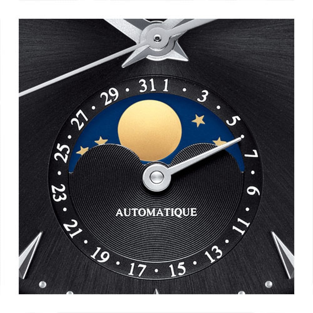 This 39 mm classic model watch features black tones on a Sunray-brushed black dial with appliqued hour-markers and displays. Stainless steel case with automatic, self-winding movement. Functions include date, hours, minutes, seconds, moon phases.