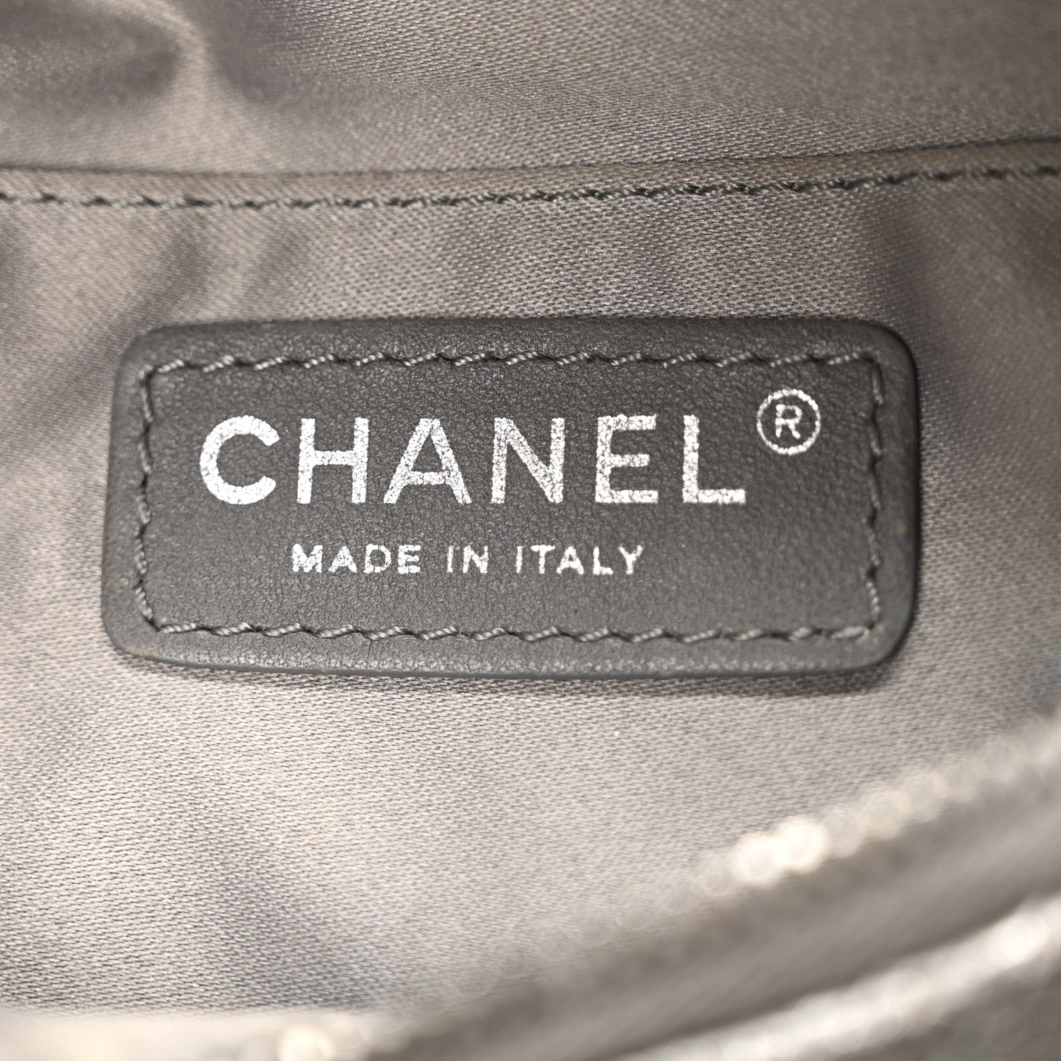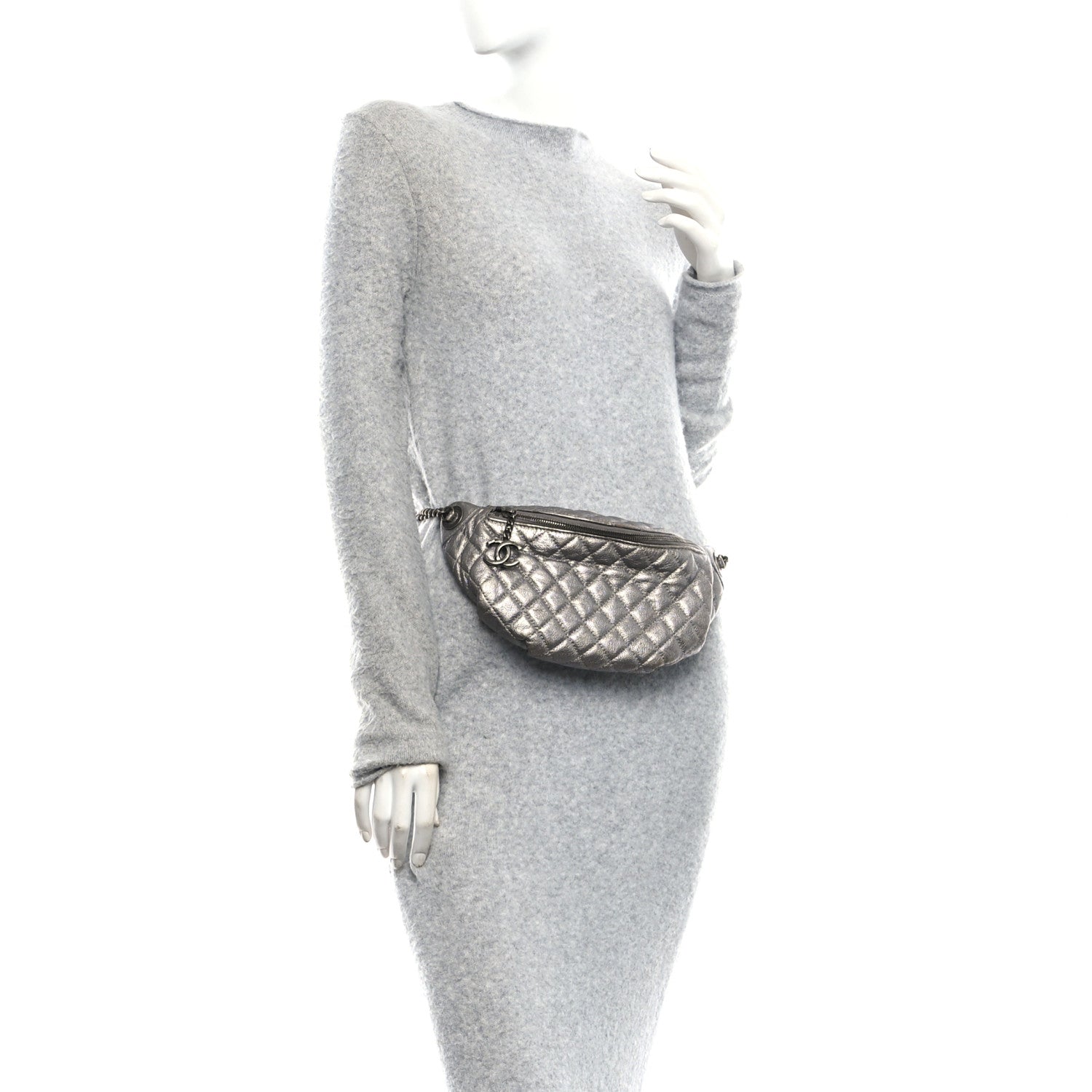 This is an authentic CHANEL Metallic Goatskin Quilted Banane Waist Bag Fanny Pack in Silver. This waist bag is finely crafted of diamond quilted metallic goatskin leather in silver. The bag features ruthenium chain-link accents attached to the adjustable leather belt waist strap. This fanny pack features two zipper pockets; one front-facing with a ruthenium Chanel CC zipper pull and another zipper pocket on the reverse side. This bag opens to a gray satin interior with a patch pocket.