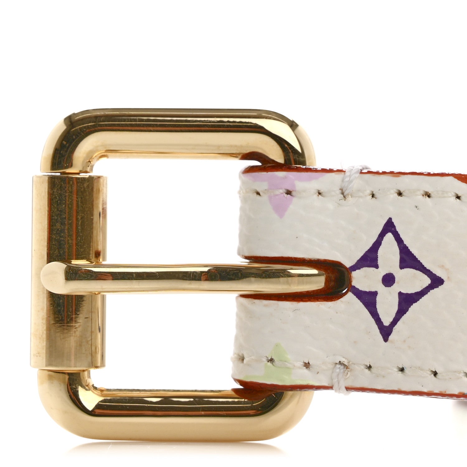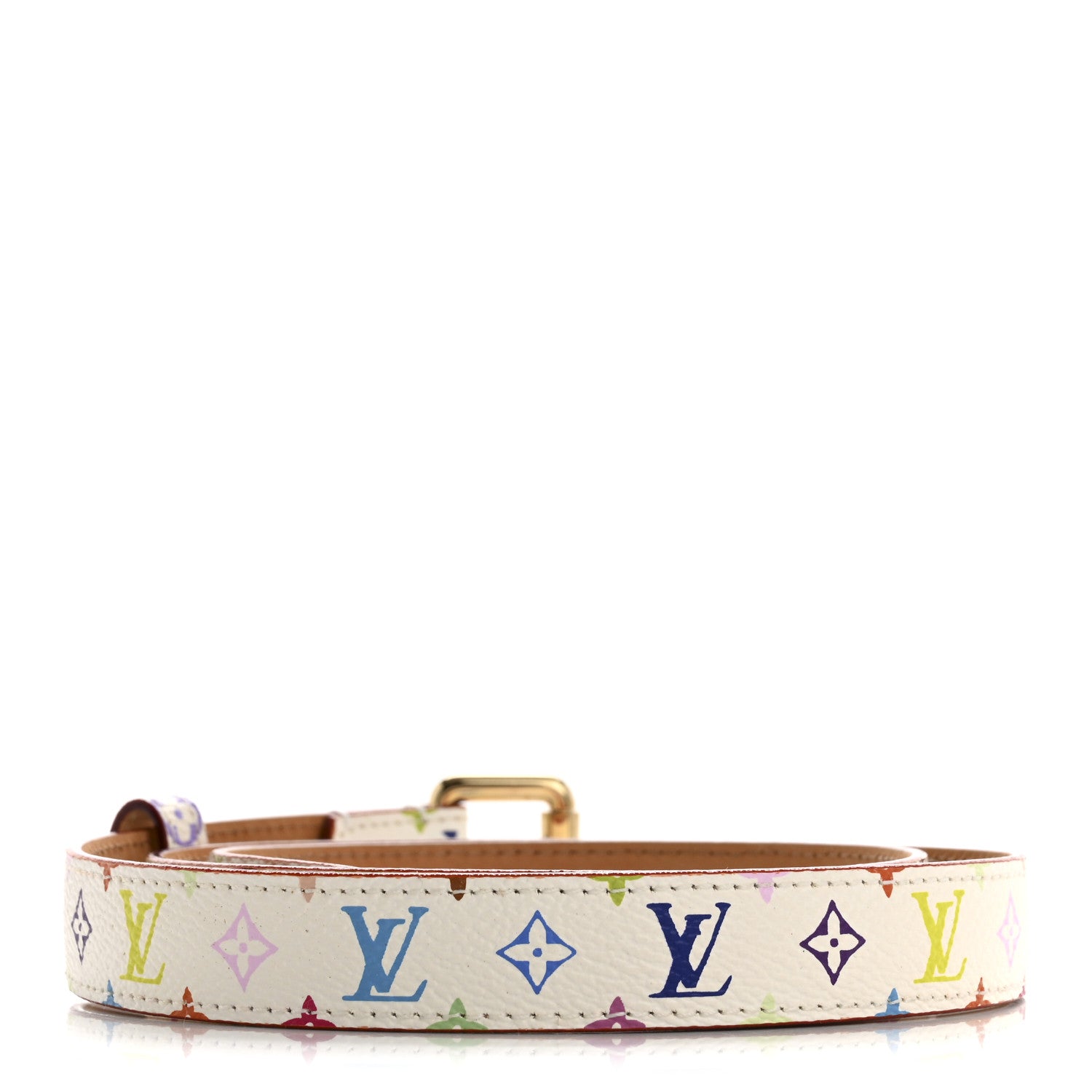 This is an authentic LOUIS VUITTON Monogram Multicolor LV Cut Reversible Belt 80 32 in White Grenade. This stylish belt is reversible with one side in brown cowhide leather and the featured side is a multicolore Louis Vuitton monogram in 33 vivid colors on white toile canvas.