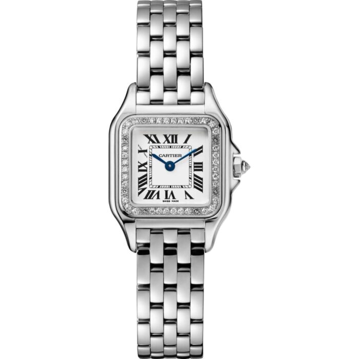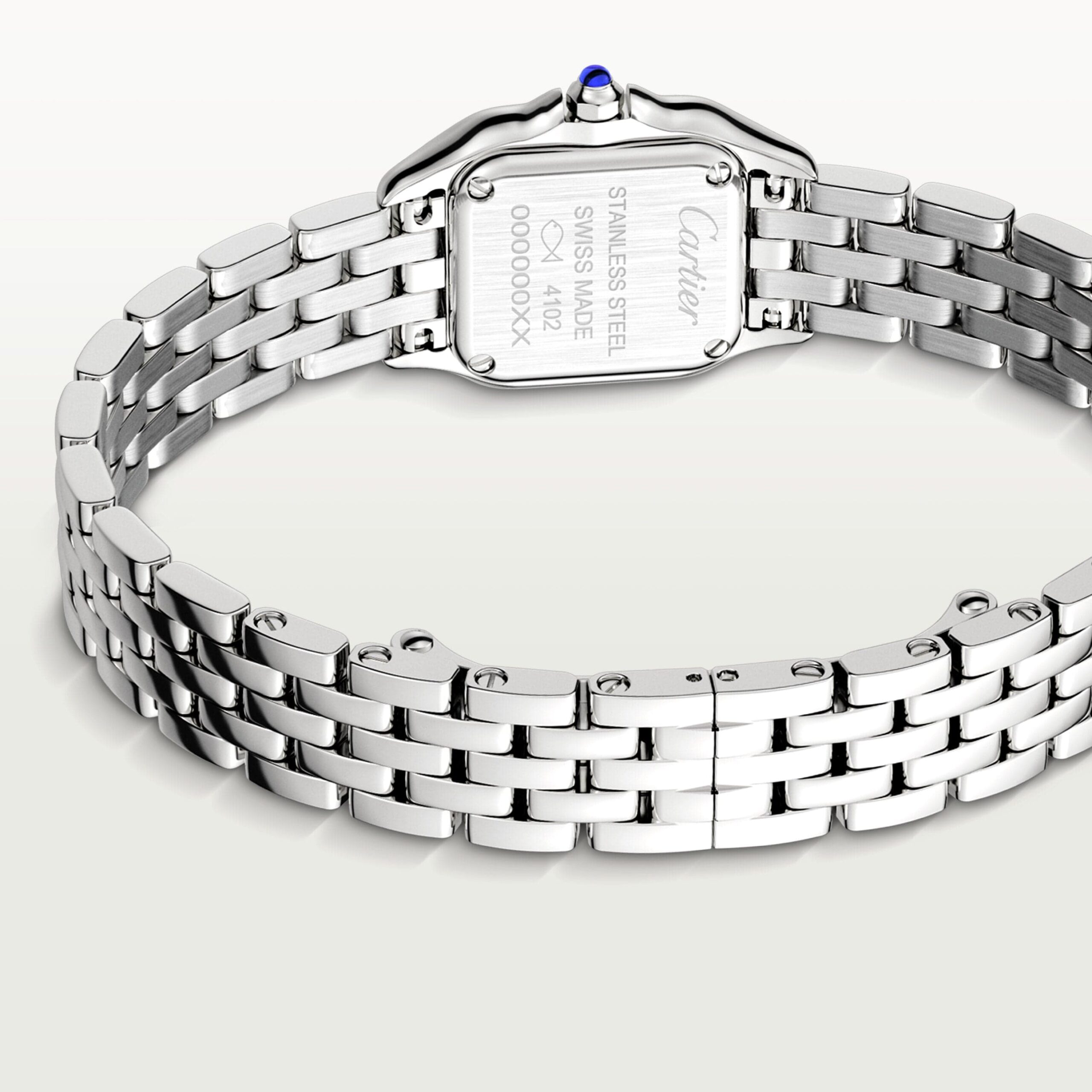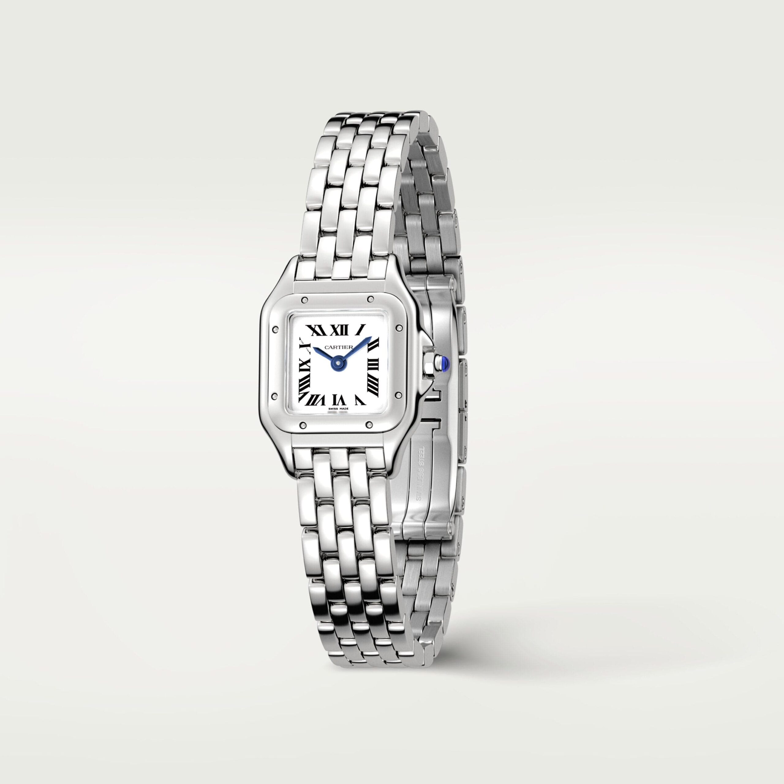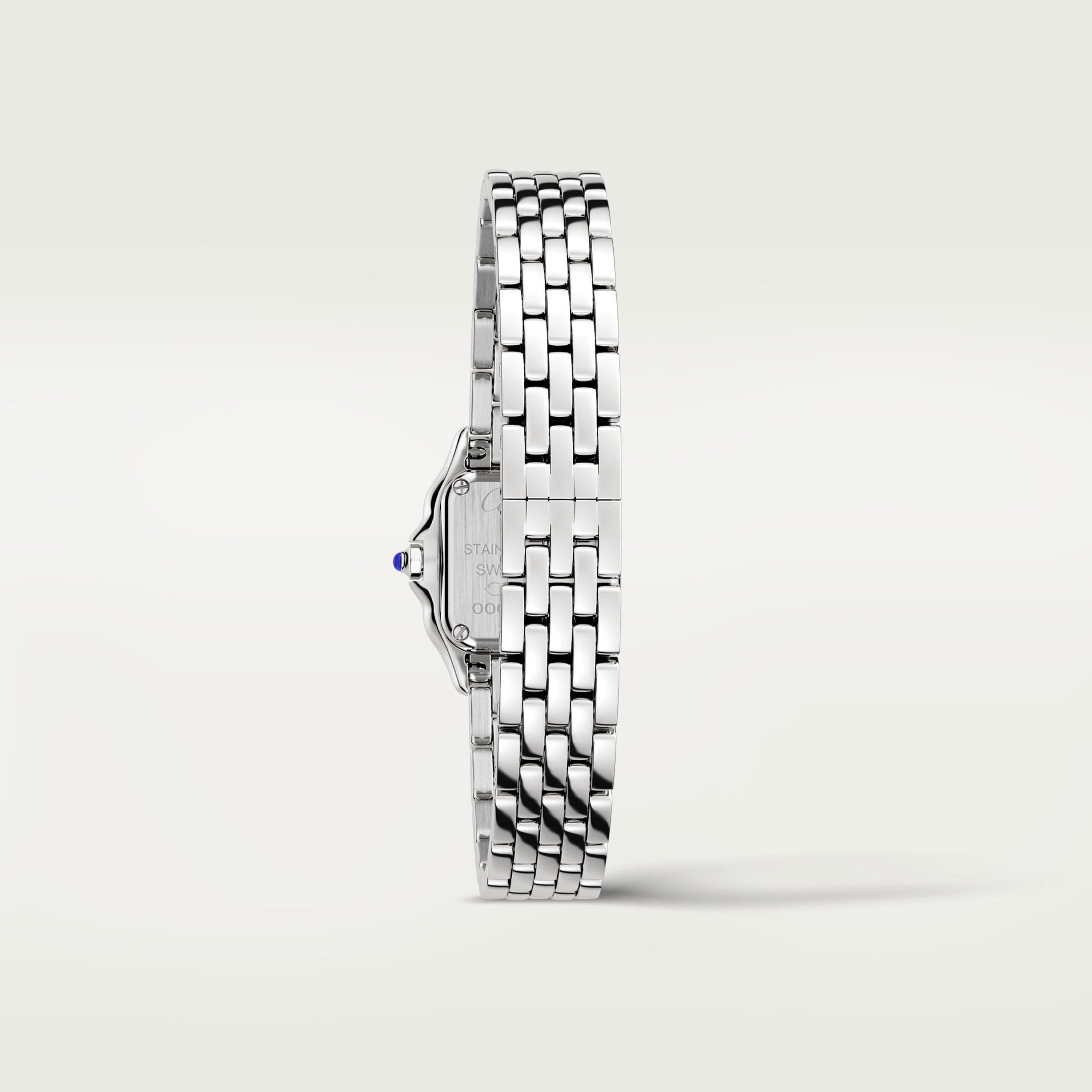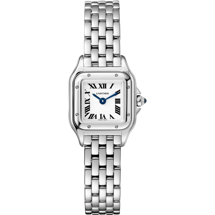 Panthère de Cartier watch, mini model, quartz movement. Steel case and bracelet. Octagonal crown set with a blue synthetic spinel. Silver dial, blued-steel sword-shaped hands, sapphire crystal. Case dimensions: 25 mm x 19 mm, thickness: 6 mm. Water-resistant up to 3 bar (approx. 30 meters/100 feet).