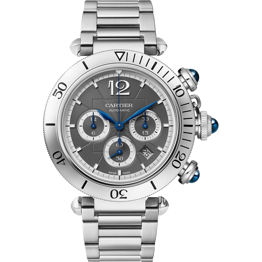 Pasha de Cartier watch, 41 mm, chronograph mechanical movement with automatic winding, caliber 1904-CH MC. Steel case, fluted crown protector, crown and push-pieces set with synthetic spinels, anthracite flinqué dial, blued-steel diamond-shaped hands, steel strap with “SmartLink” adjustment system, second strap in dark gray alligator leather, interchangeable steel deployant buckle. Both are fitted with the “QuickSwitch” interchangeability system. Case diameter: 41 mm, thickness: 11.97 mm. Water-resistant up to 10 bar (approx. 100 meters/330 feet).