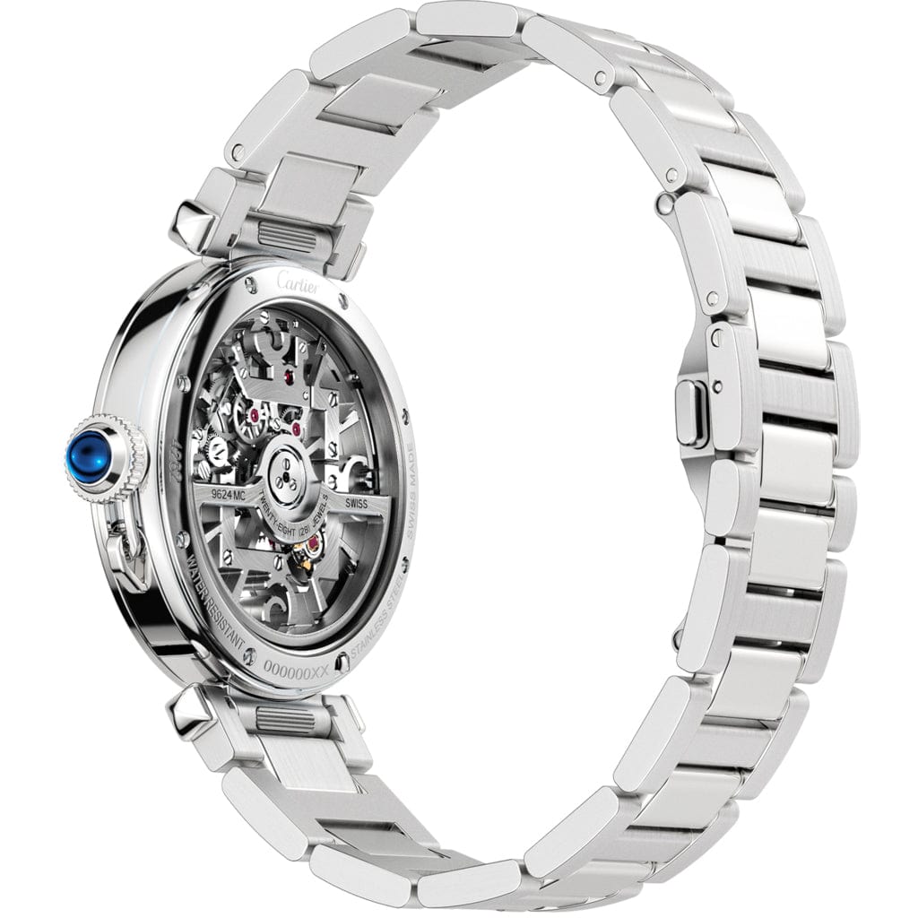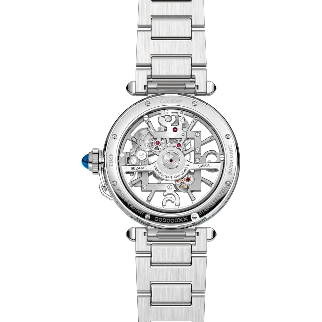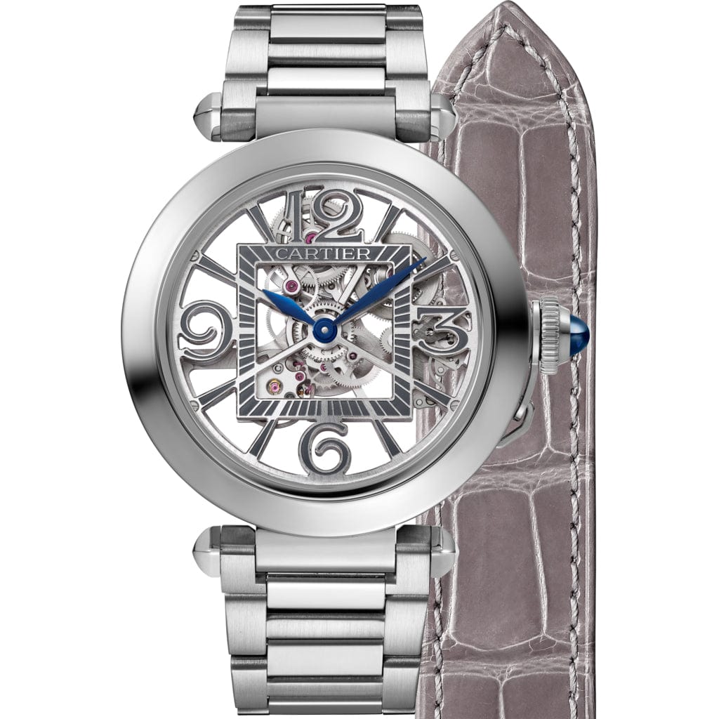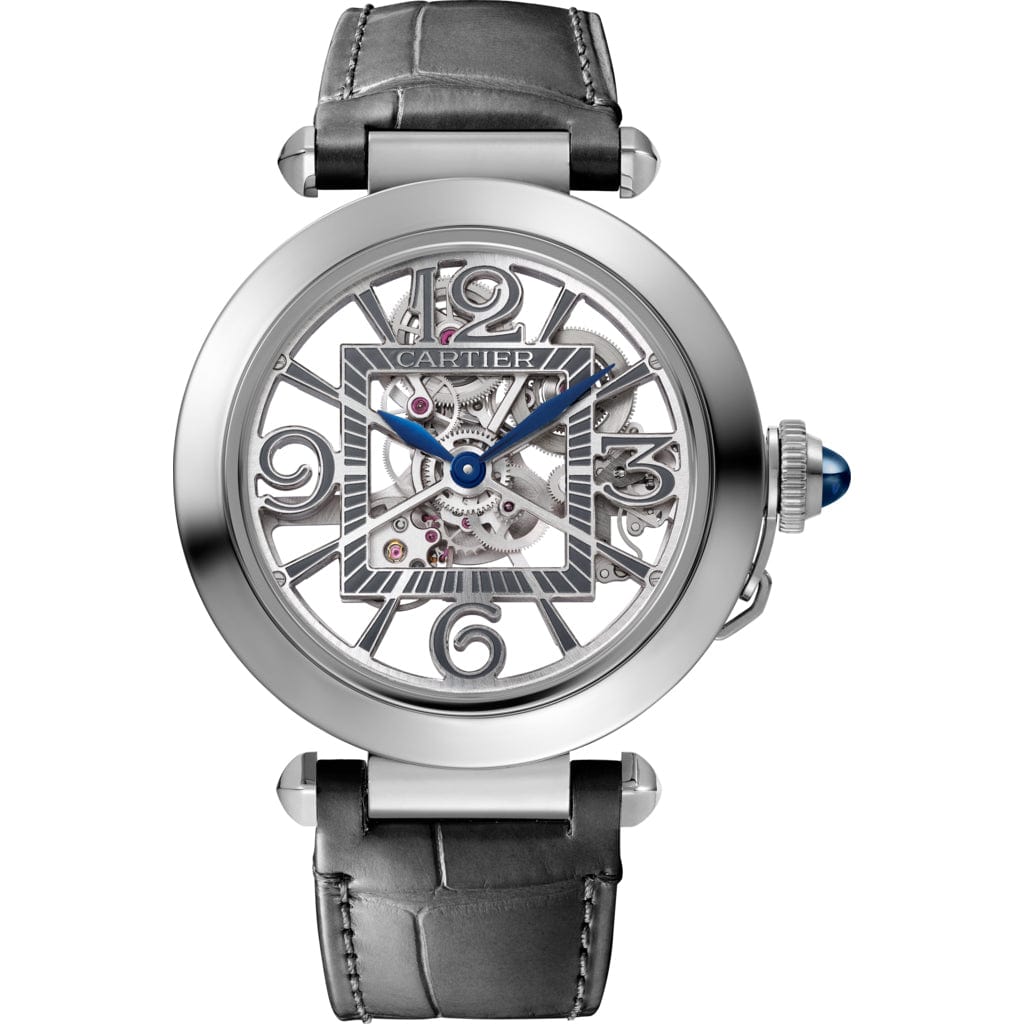 Pasha de Cartier watch, 41 mm, skeleton, mechanical movement with automatic winding, caliber 9624 MC. Steel case, fluted crown cap and crown set with sapphires, blued-steel diamond-shaped hands, steel bracelet with “”SmartLink”” adjustment system, second strap in dark gray alligator skin, interchangeable steel deployant buckle. Both bracelets are fitted with the “”QuickSwitch”” interchangeability system. Hours and minutes with skeletonized bridges forming Arabic numerals. Movement consisting of 172 parts including 28 rubies. Movement diameter: 31.63 mm, movement thickness: 5.66 mm, balance: 28,800 vibrations/hour, power reserve approx. 48 hours. Case diameter: 41 mm, thickness: 10.45 mm. Water-resistant to 3 bar (approx. 30 meters/100 feet).