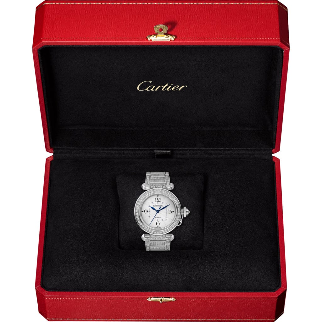 Pasha de Cartier watch, 35 mm, mechanical movement with automatic winding, caliber 1847 MC. Rhodiumized 18K white gold case, bezel, bracelet and crown protector set with 488 brilliant-cut diamonds totaling 8.78 carats, crown set with a sapphire, silver flinqué dial, blued-steel diamond-shaped hands, rhodiumized 18K white gold bracelet. Case diameter: 35 mm, thickness: 9.37 mm. Water-resistant up to 10 bar (approx. 100 meters/300 feet).
