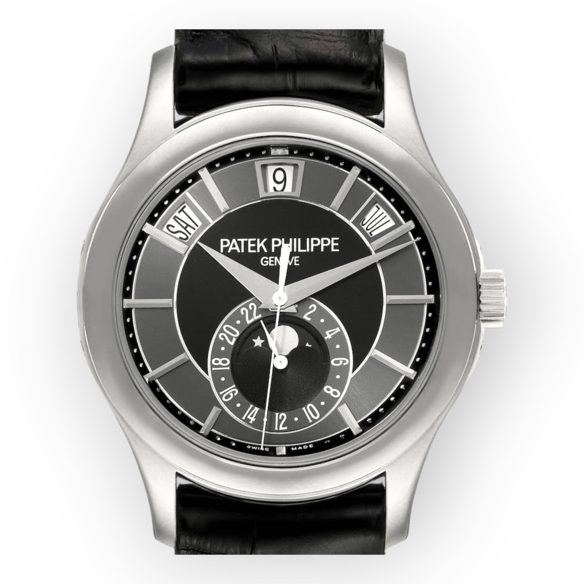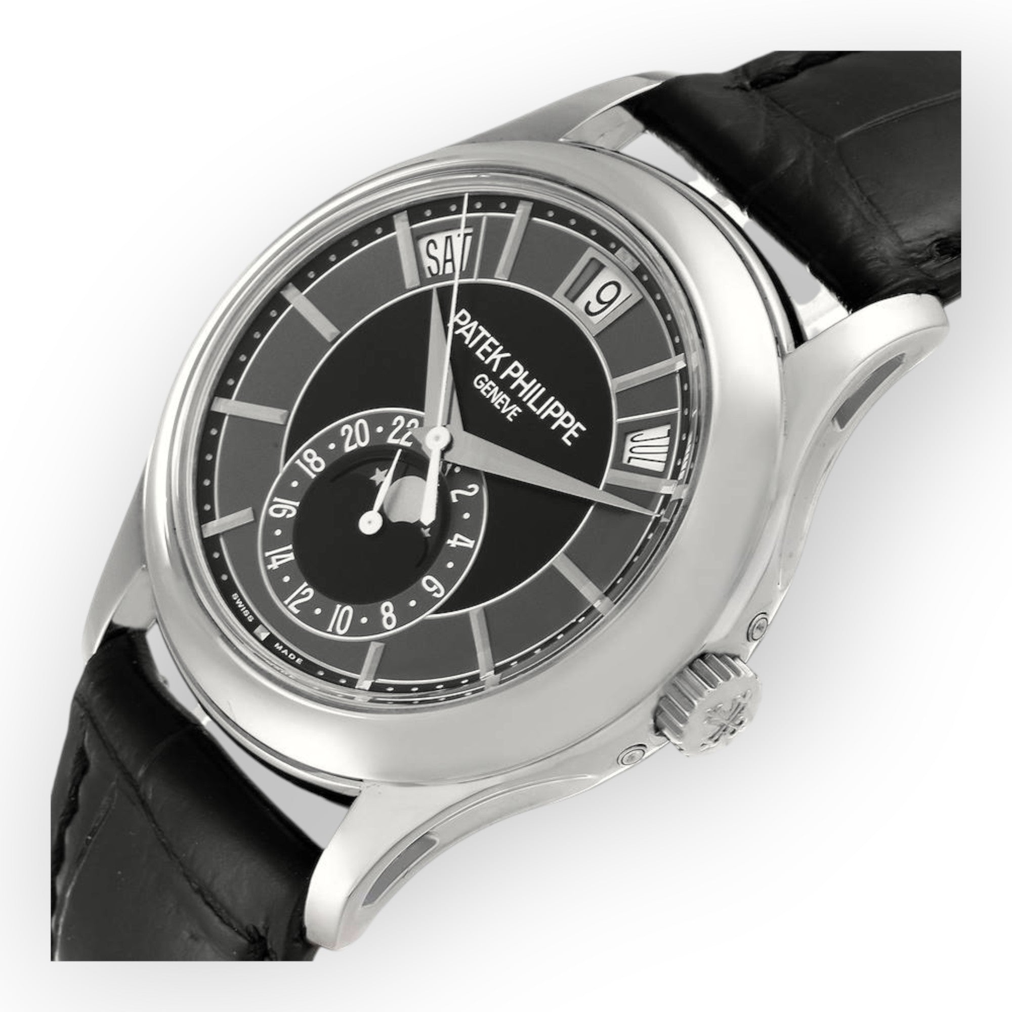 Dial: Gray dial with applied white gold baton hour markers. White gold epee hands. Annual calendar complication displaying the Day, Date & Month through windows located beneath the 10, 12 and 2 o’clock positions. Sub-dial at the 6 o’clock position doubles as the Moon phase & an AM/PM indicator.