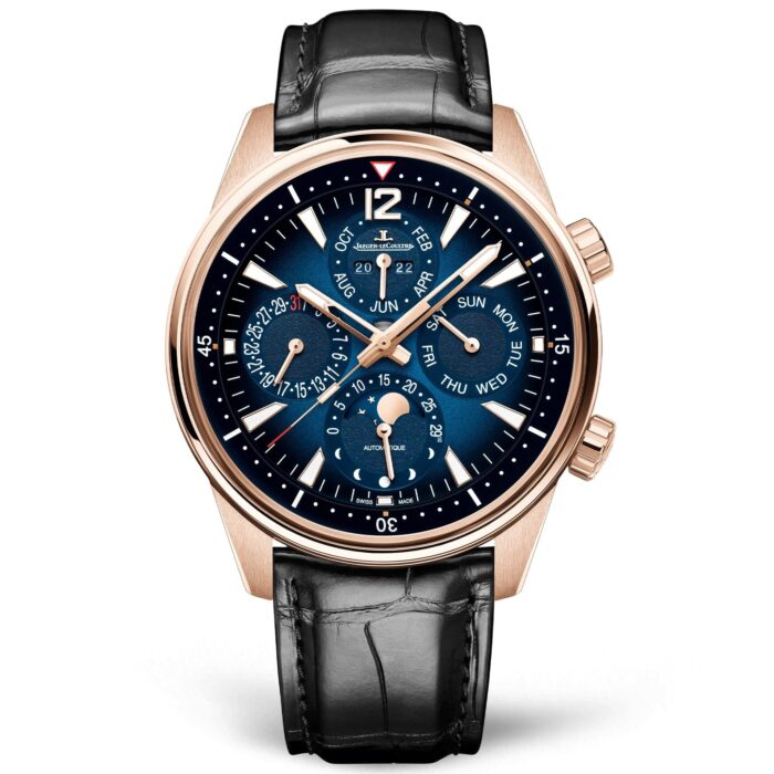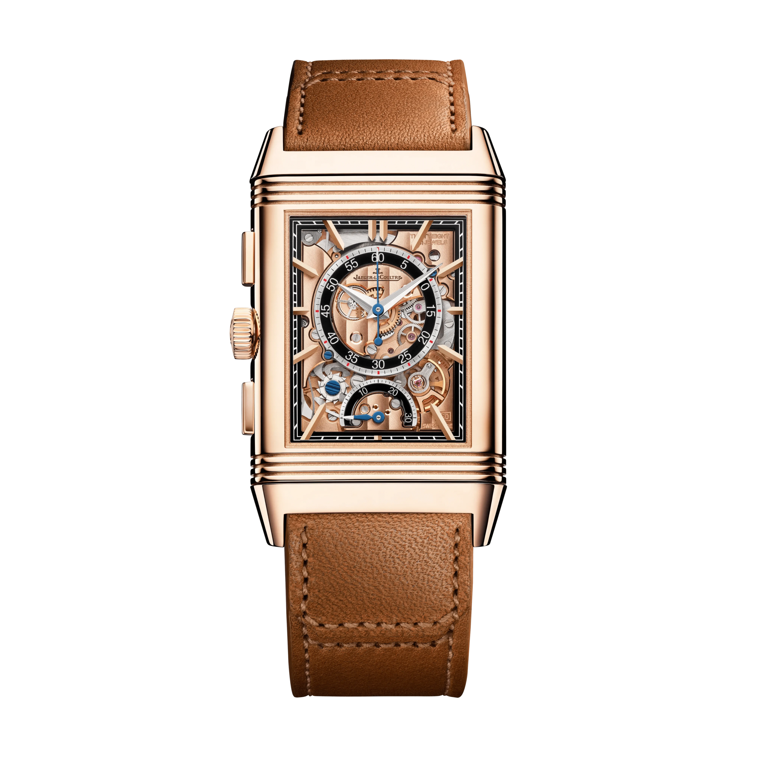 On the Reverso Tribute Chronograph, the case, dial and Calibre 860 are adorned in pink gold. Beneath the all-gold dial on the front, the highly sophisticated reverse reveals the workings of the chronograph with its retrograde 30-minute counter. The excellent legibility of the watchmaking expertise really stands out here: applied hour markers and a floating chemin de fer on the rehaut, a blue minute hand, skeletonised and beveled bridges… with a pair of interchangeable straps included, one in brown calfskin based on a design by Casa Fagliano and the other in black alligator, the Reverso Tribute Chronograph watch gives reversibility a style as precious as it is refined.