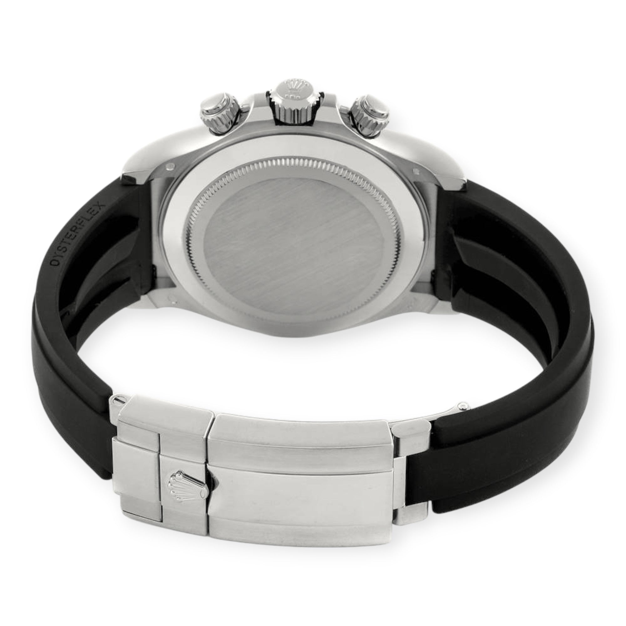 Bracelet: Black Oysterflex rubber strap with an 18K white gold flip-lock clasp.