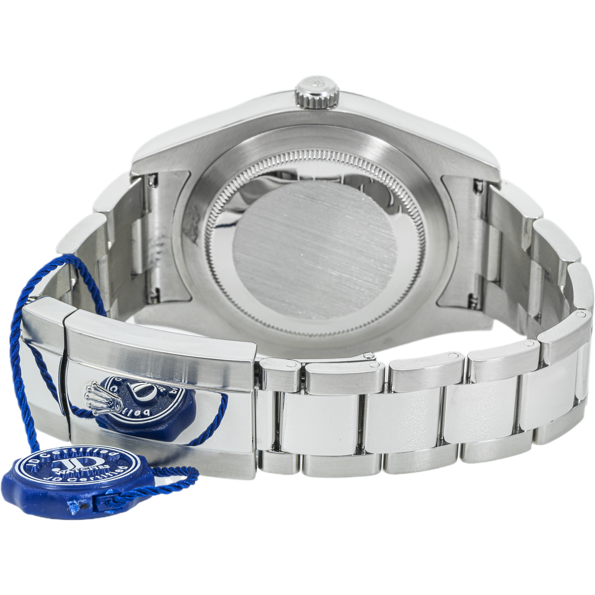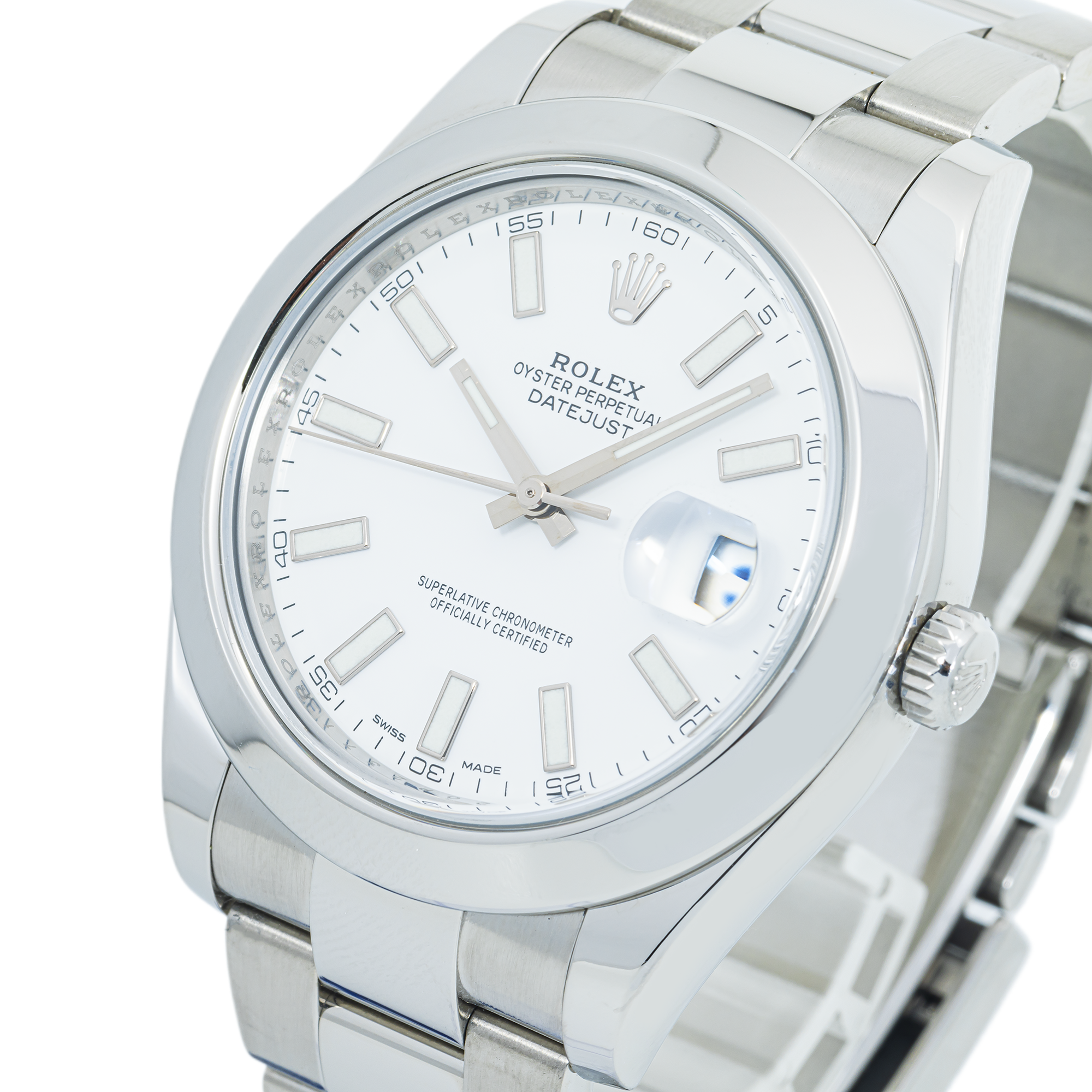 Discover the Rolex Datejust II 116300 with a bold 41mm stainless steel case, smooth bezel, and crisp white dial—where timeless elegance meets modern style.