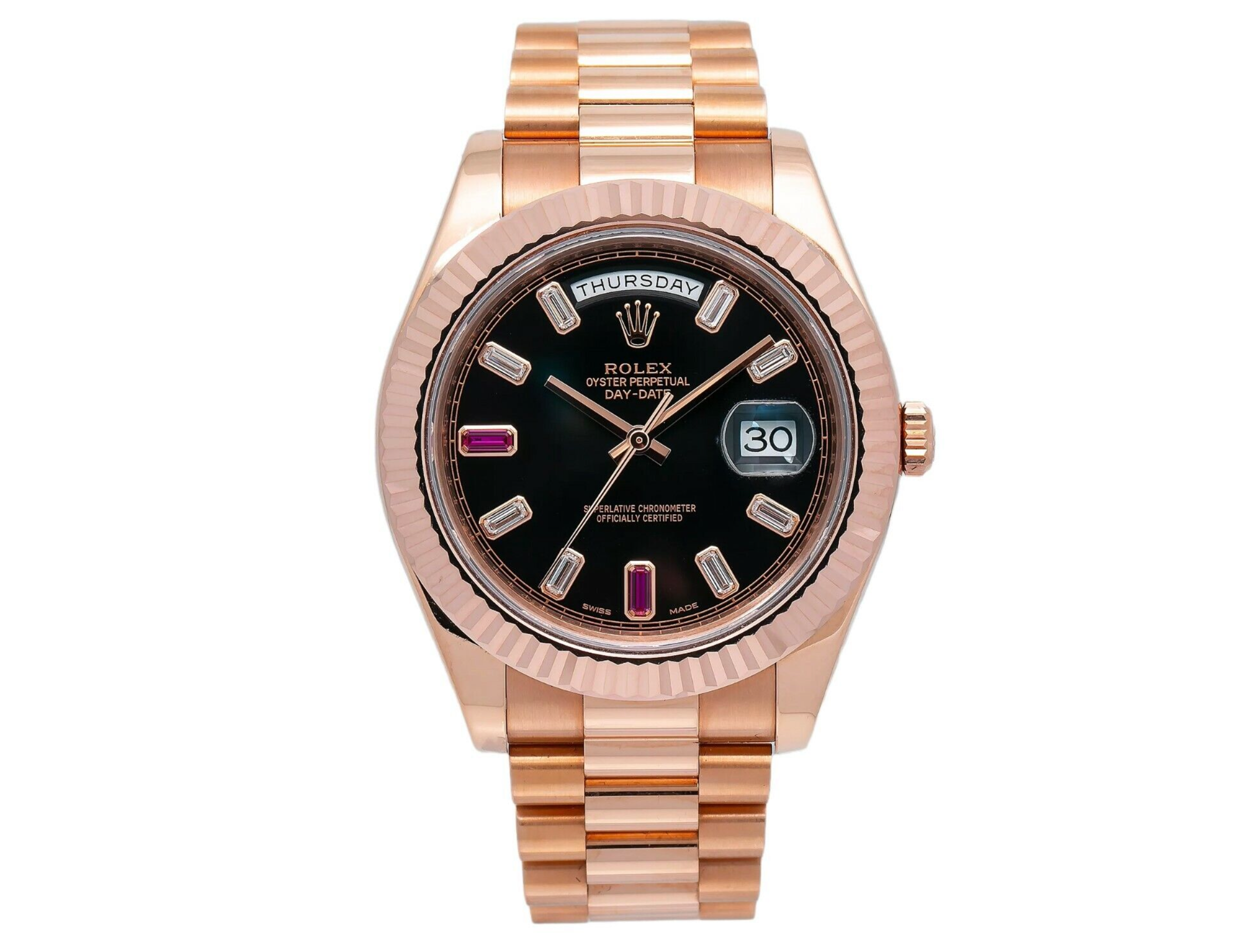 Rolex Day-Date II 41mm 218235 – Black Dial with Factory Ruby & Diamond Markers – 18K Rose Gold President Bracelet