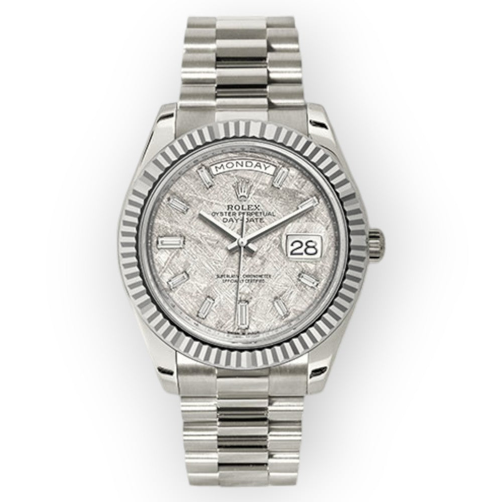 Rolex White Gold Day-Date 40 Watch Meteorite Baguette Diamond Dial – President Bracelet