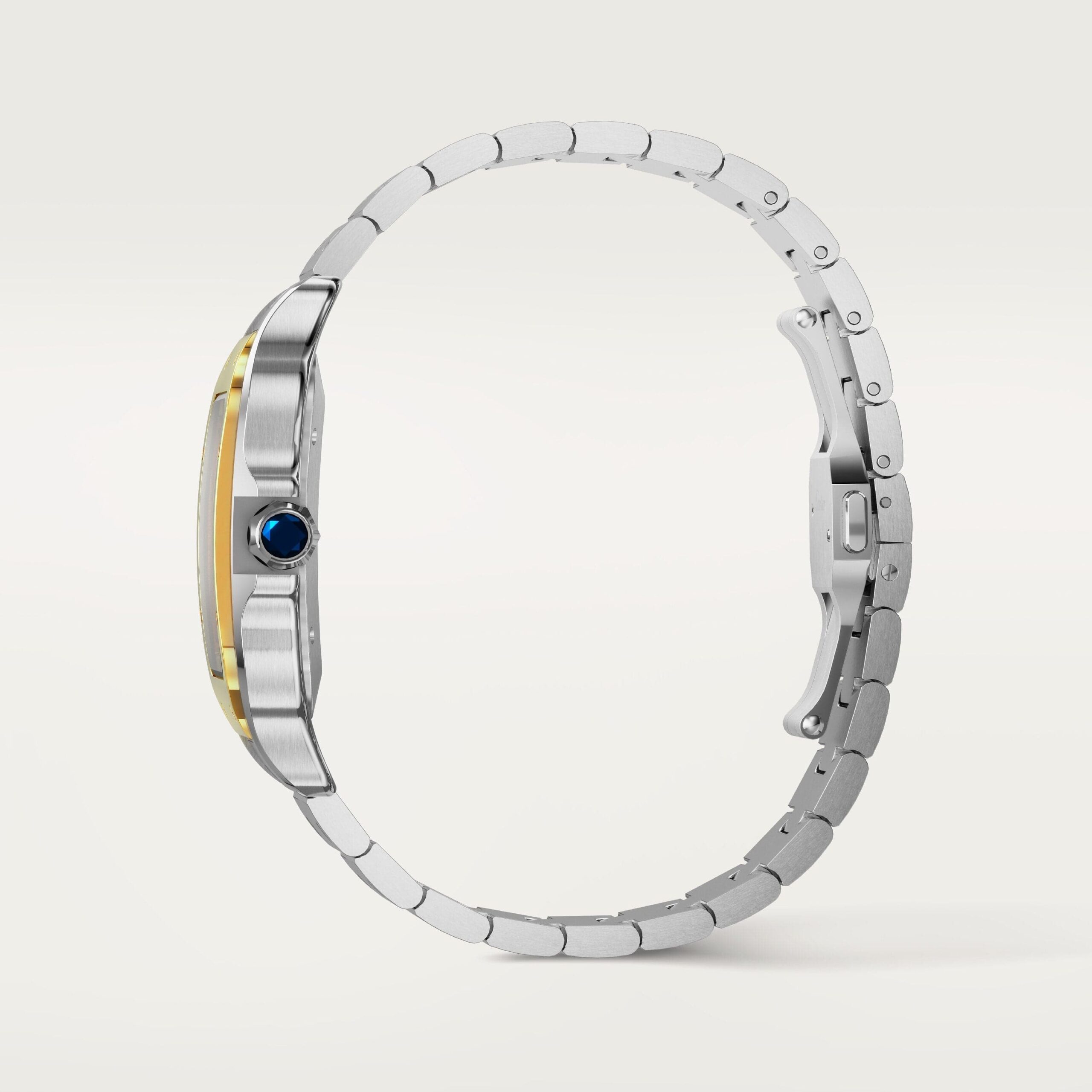 Santos de Cartier watch, large model, mechanical movement with automatic winding caliber 1847 MC. Steel case, bezel in yellow gold (750/1000), 7-sided crown set with a faceted synthetic blue spinel, anthracite gray dial with satin-finish gradation, sword-shaped hands in polished gold-plated steel, sapphire crystal. Steel bracelet with “SmartLink” adjustment system. Second strap in gray leather, with interchangeable steel folding buckle. Both bracelets are fitted with the “QuickSwitch” interchangeability system. Case width: 39.8 mm, thickness: 9.38 mm. Water-resistant to 10 bar (approx. 100 meters).
