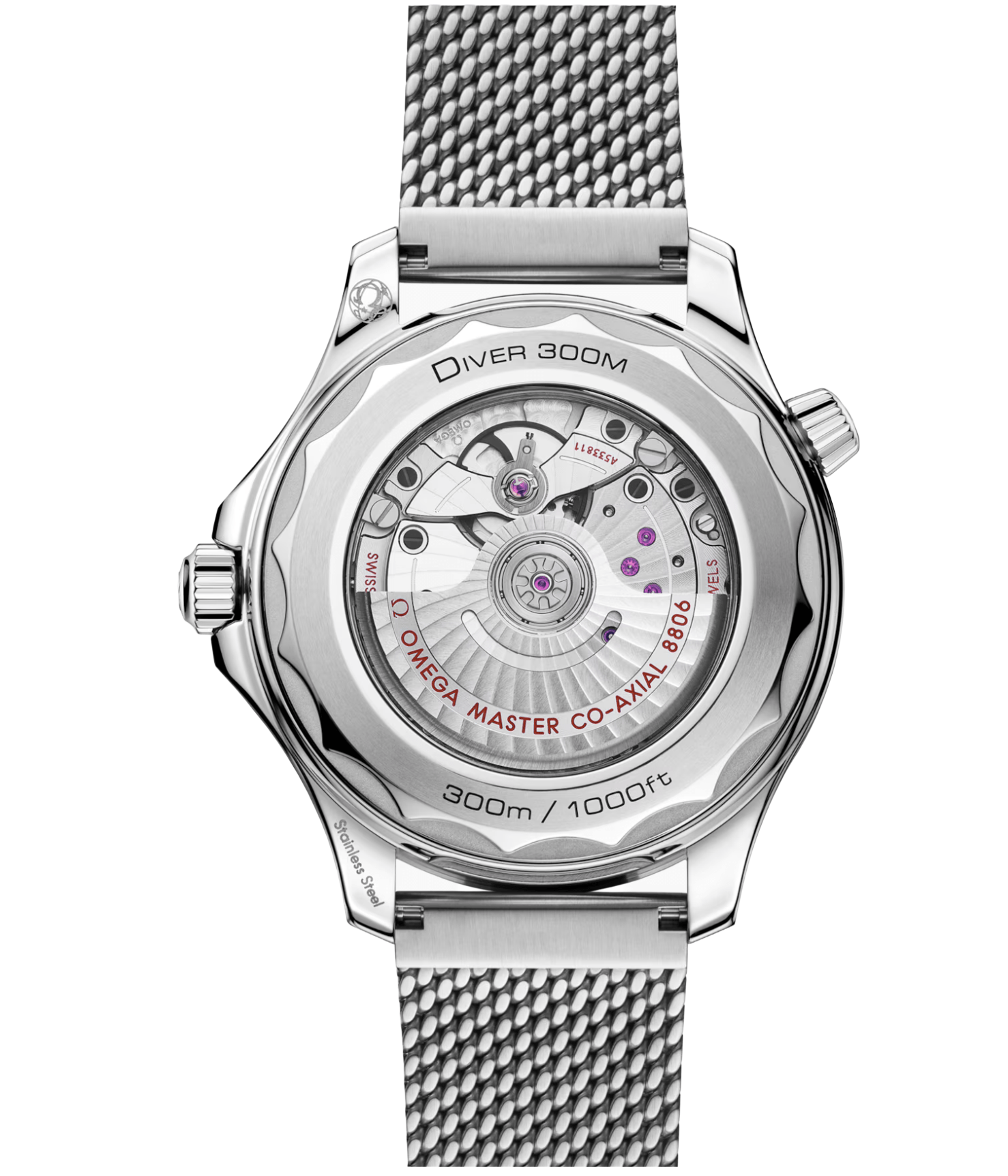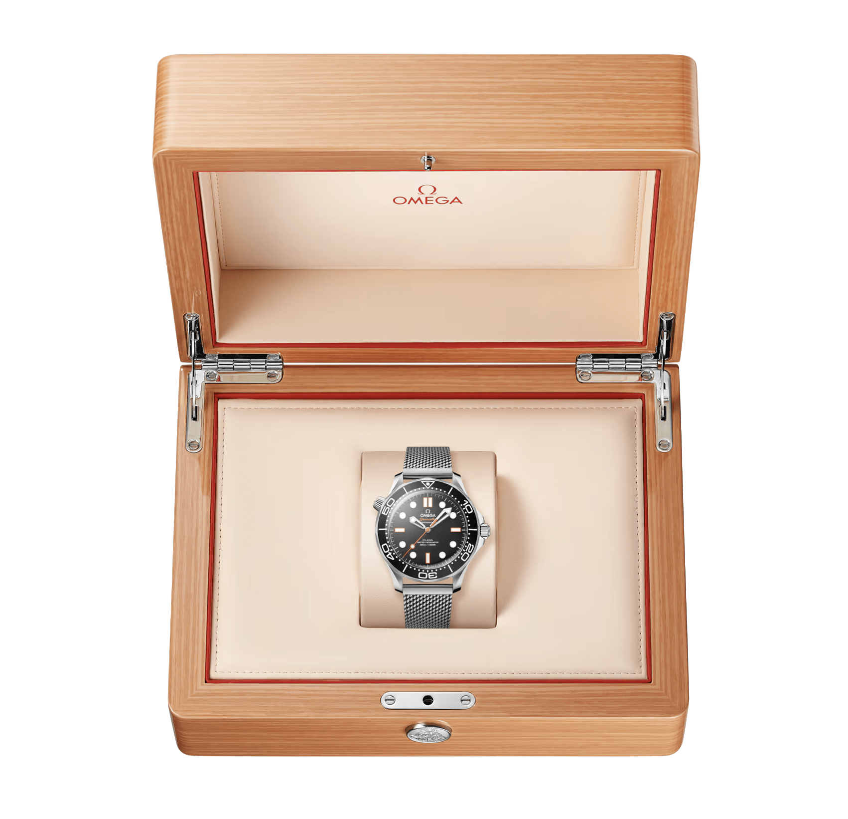 This 42 mm model is crafted in stainless steel and includes a black oxalic anodized aluminium bezel ring with a diving scale in white Super-LumiNova. Black aluminium is also used to create the dial, which features rhodium plated skeletonized hands and indexes that are filled with white Super-LumiNova. The colour orange is used for the central seconds hand, the four quarter indexes, and Seamaster name, while the OMEGA logo is transferred in white.