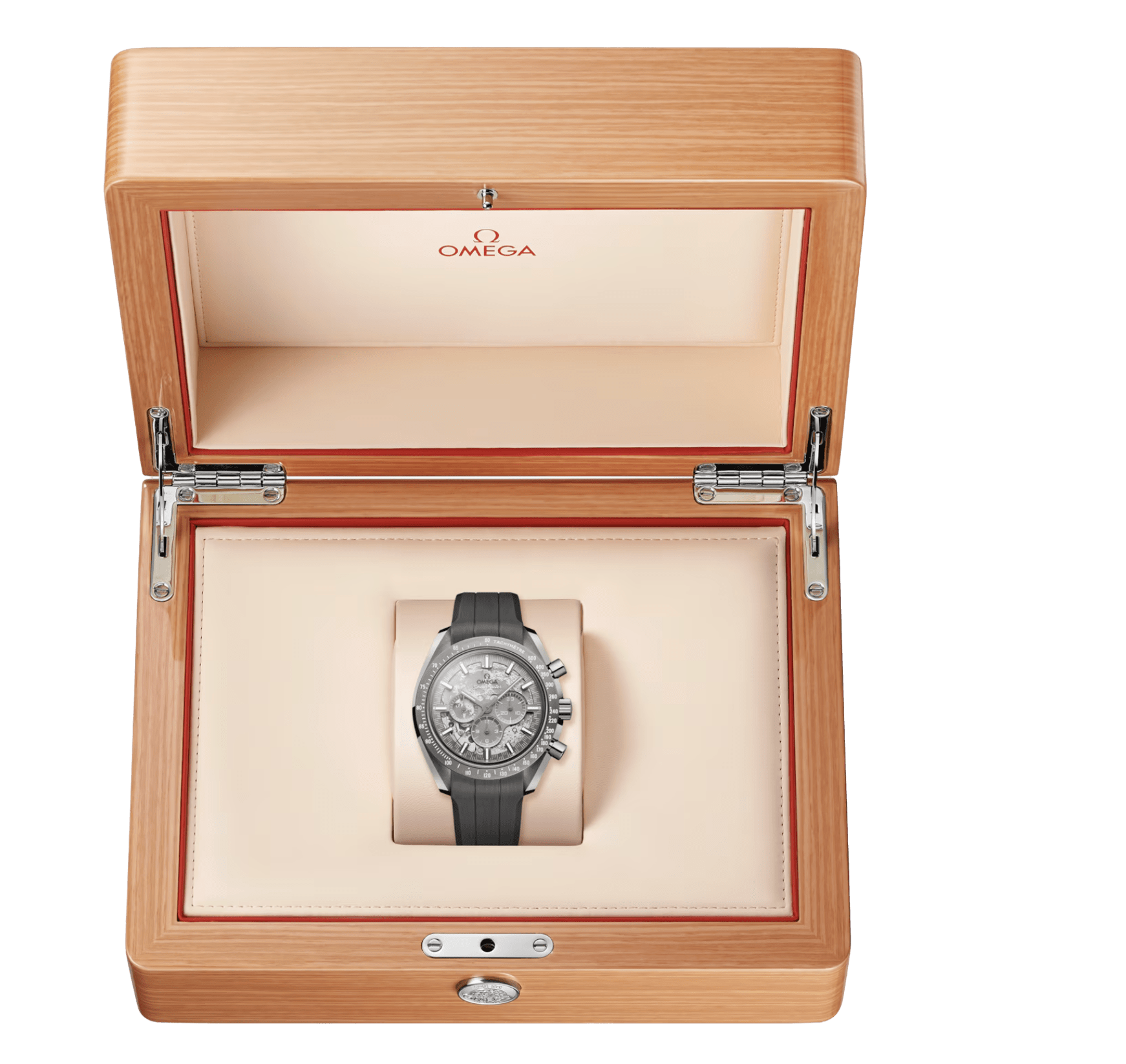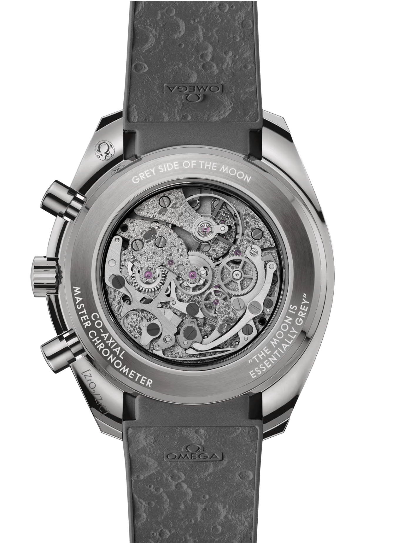 Beneath the front sapphire crystal, OMEGA’s connection to the moon is celebrated via the specially decorated movement, which is laser-ablated on the main plate and bridges to represent the moon’s surface. The near side can be seen on the skeletonized grey anodised aluminium dial, while the far side can be seen through the caseback.