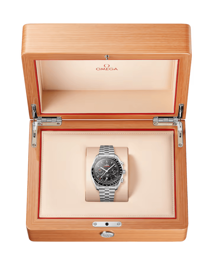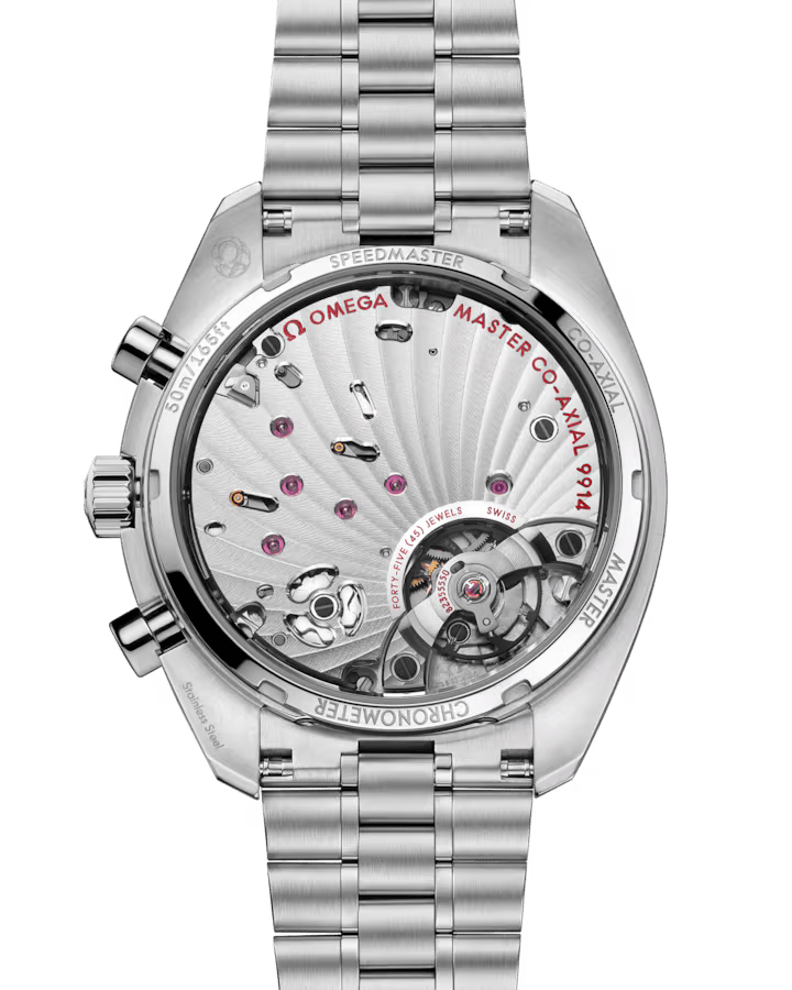 Manual-winding chronograph with OMEGA column wheel and Co-Axial escapement. Certified Master Chronometer, approved by METAS, resistant to magnetic fields up to 15,000 Gauss. Silicon balance-spring, 2 barrels mounted in series. Central hour-minute hands, small seconds hand, and date indication by hand at 9 o’clock. 12-hour and 60minute recorders at 3 o’clock. Moonphase indication at 6 o’clock. Special finish with rhodium-plated bridges, red varnished engravings, and Geneva waves in arabesque.