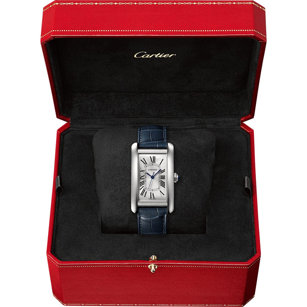 Tank Américaine watch, large model, mechanical movement with automatic winding. Steel case, octagonal crown set with a blue synthetic spinel, silvered dial, blued-steel sword-shaped hands, navy blue semi-matte alligator leather strap, interchangeable deployant buckle. Case dimensions: 45.10 mm x 26.60 mm, thickness: 9.65 mm. Water-resistant up to 3 bar (approx. 30 meters/100 feet).
