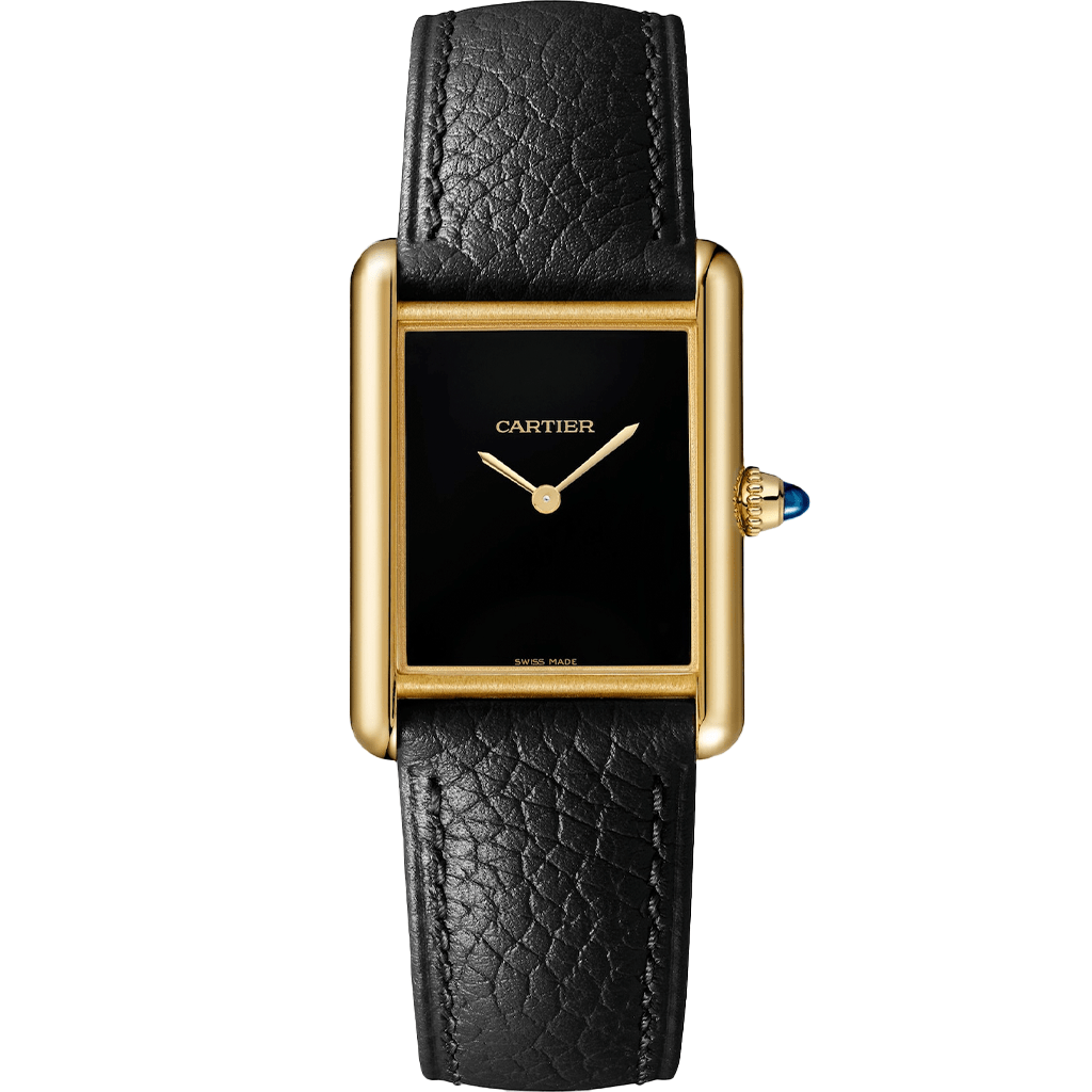 Tank Louis Cartier watch, large model, Manufacture mechanical movement with manual winding. Case in yellow gold 750/1000, beaded crown set with a sapphire, black lacquer dial, golden-finish steel sword-shaped hands, mineral crystal, black leather strap, ardillon buckle in yellow gold 750/1000. Case dimensions: 1.32” x 1”, thickness: 0.25”. Water-resistant up to 3 bar (approx. 30 meters/100 feet).