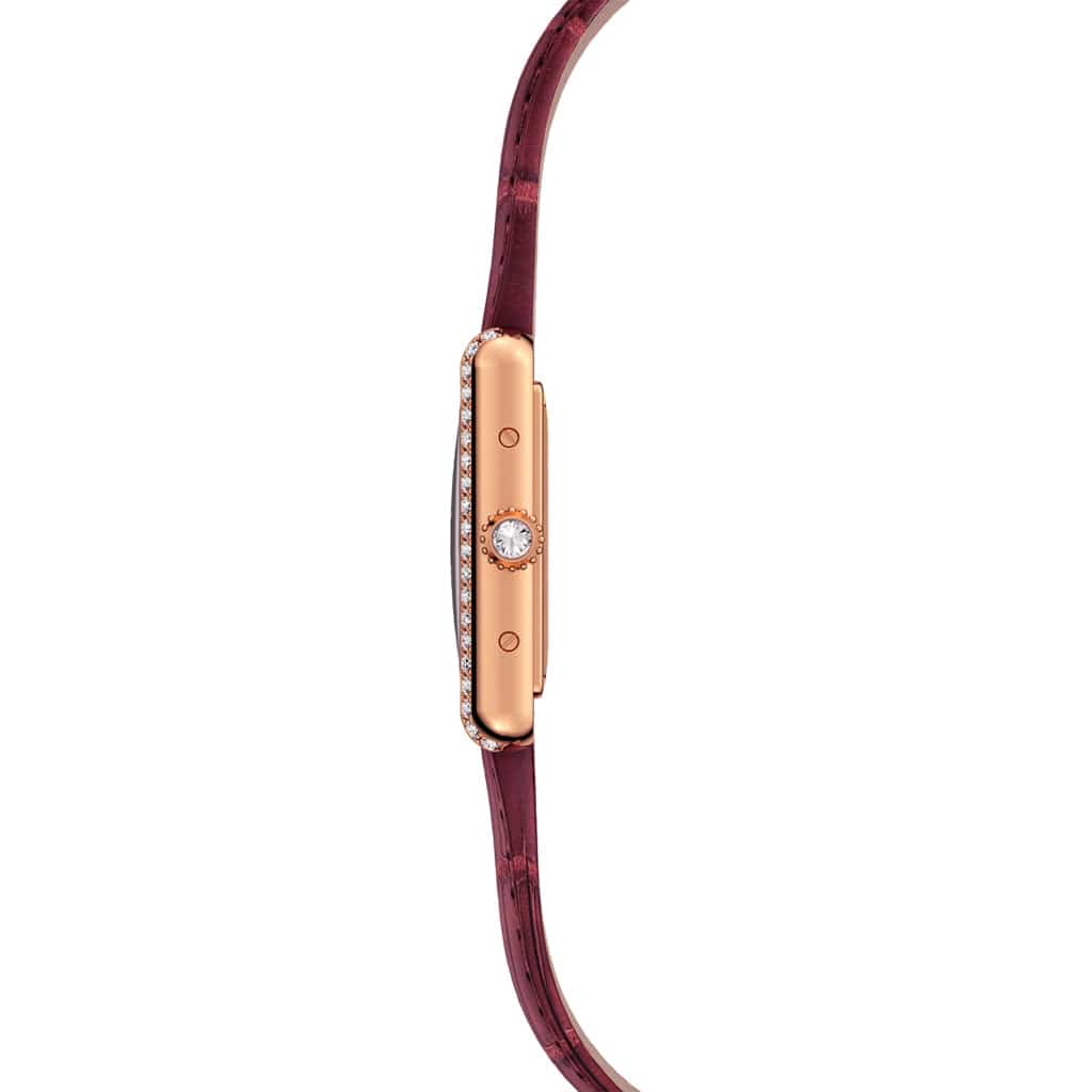 Small model, hand-wound mechanical movement, rose gold, diamonds, leather