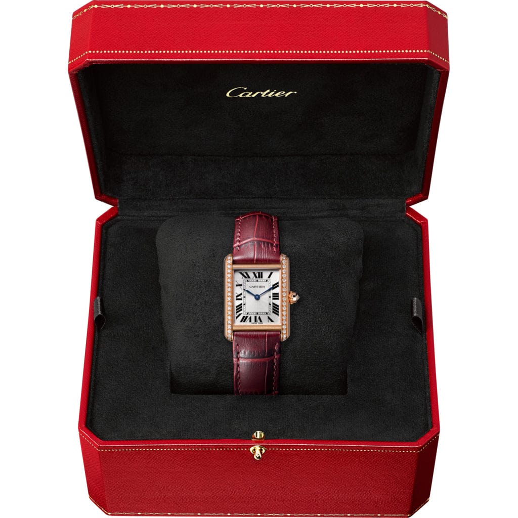 Tank Louis Cartier watch, small model, Manufacture mechanical movement with manual winding. Case and beaded crown in rose gold 750/1000 set with 41 brilliant-cut diamonds totaling 0.47 carat. Silver-grained dial, blued-steel sword-shaped hands, mineral crystal, claret alligator-skin strap, ardillon buckle in rose gold 750/1000. Case dimensions: 29.5 mm x 22.0 mm. Thickness: 6.8 mm. Water-resistant up to 3 bar (approx. 30 meters/100 feet).