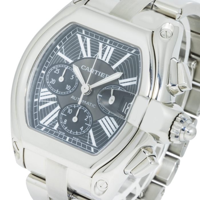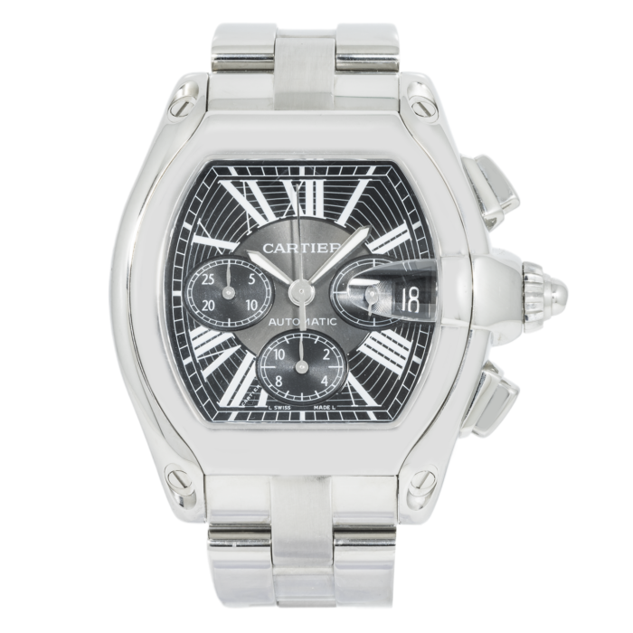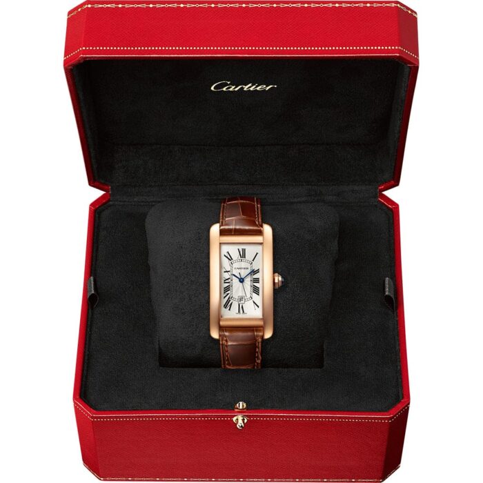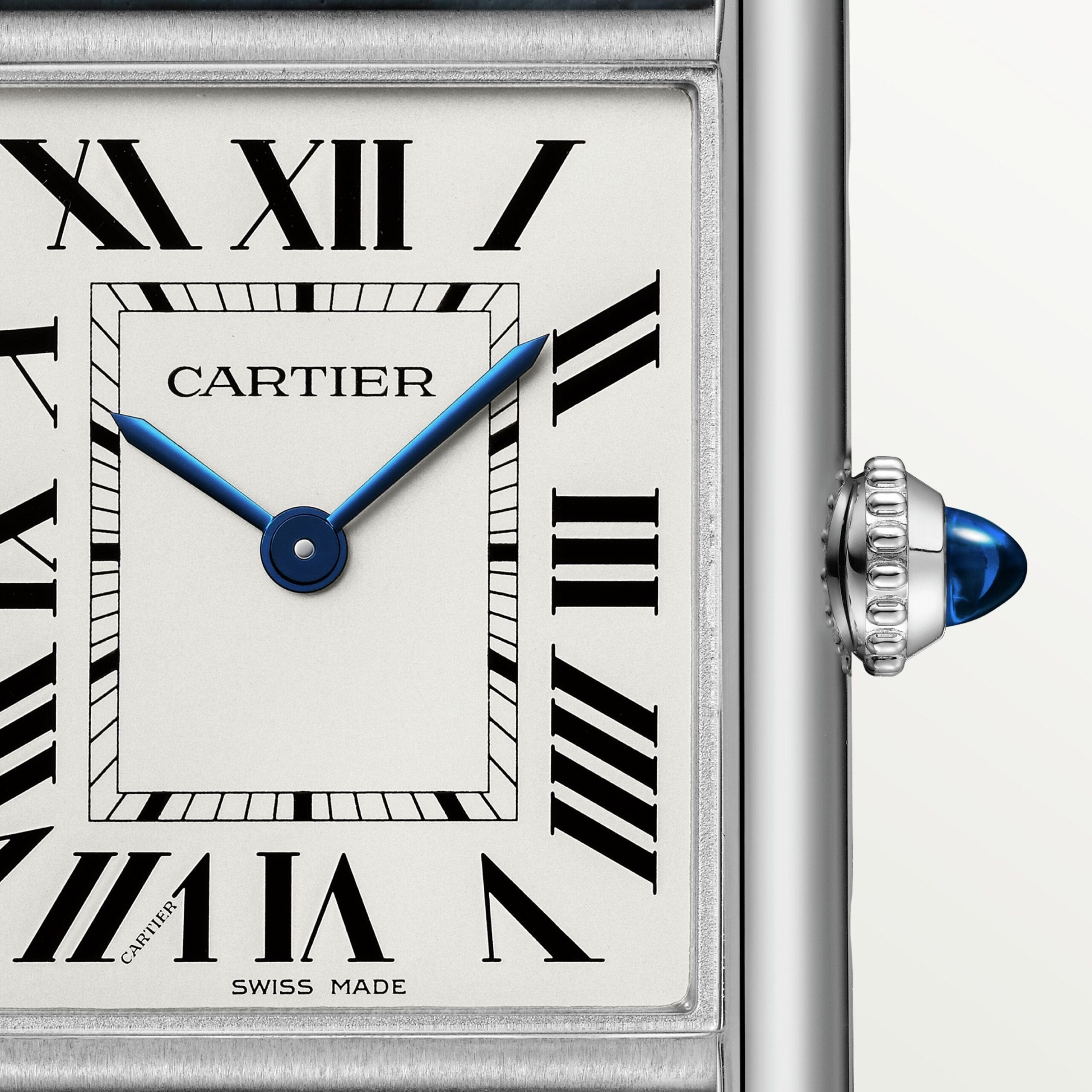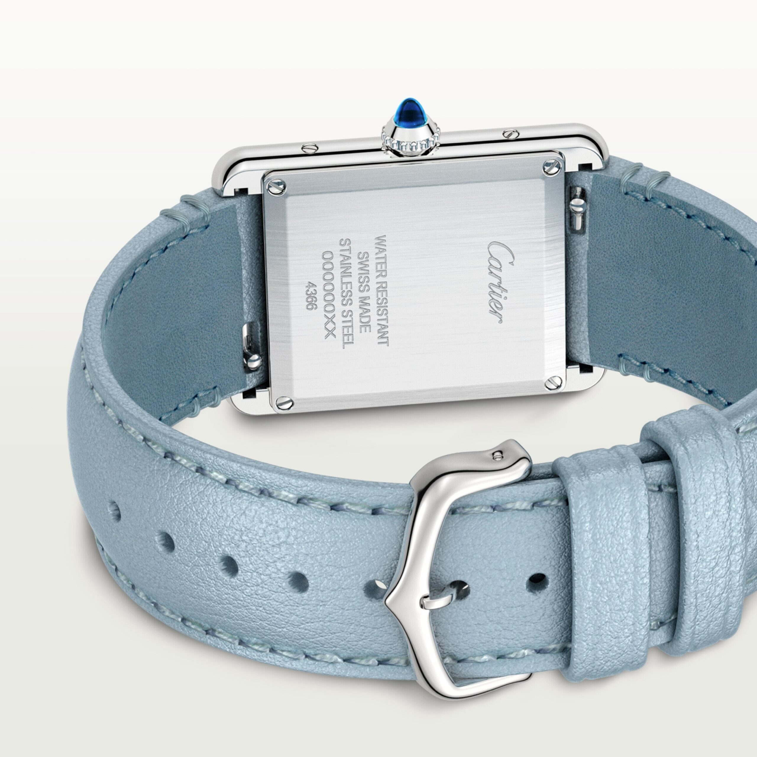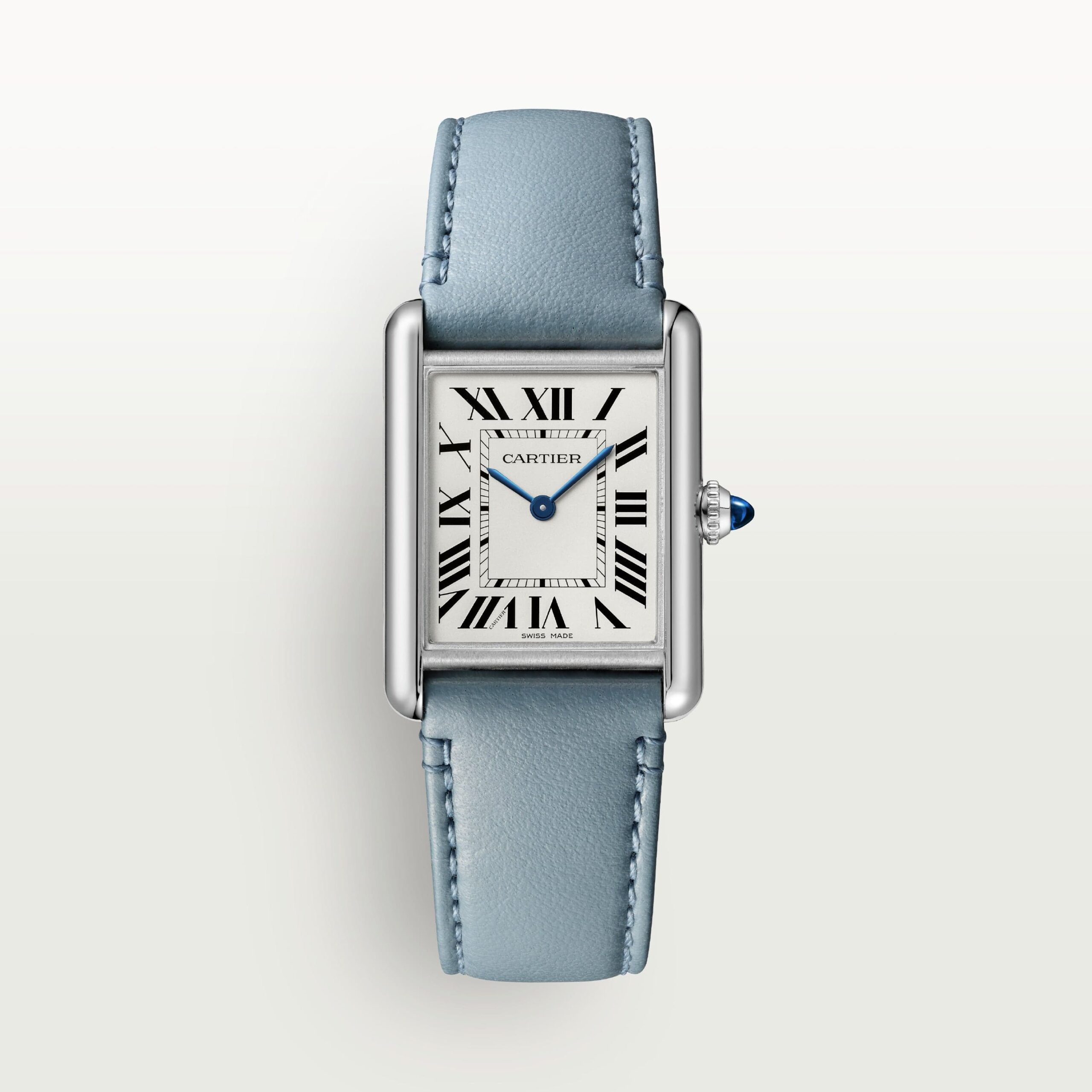 Tank Must watch, large model, photovoltaic SolarBeat™ movement. Steel case, beaded crown set with a synthetic cabochon-shaped spinel, silvered dial, blued-steel sword-shaped hands, blue strap (made with non-animal leather), steel ardillon buckle. Case dimensions: 33.7 mm x 25.5 mm, thickness: 6.6 mm. Water-resistant to 3 bar (approx. 30 meters).